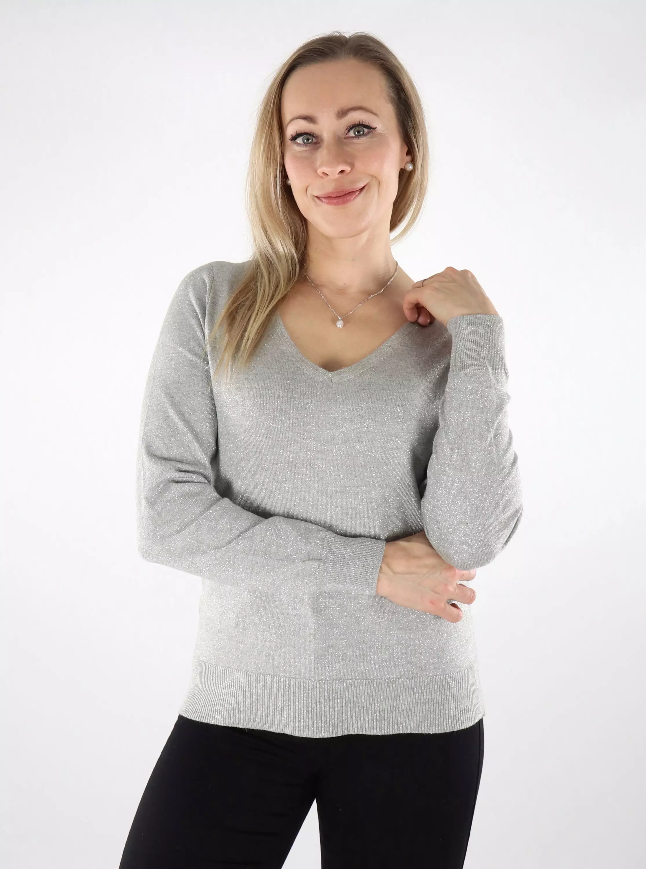Vero Modan upea glitterneule, jota voidaan käyttää molemminpäin! Toisella puolella pyöreä pääntie, toisella puolella V-pääntie. Yhdistä arkeen farkkujen kanssa ja juhlaan pinnoitetun hameen kaveriksi!