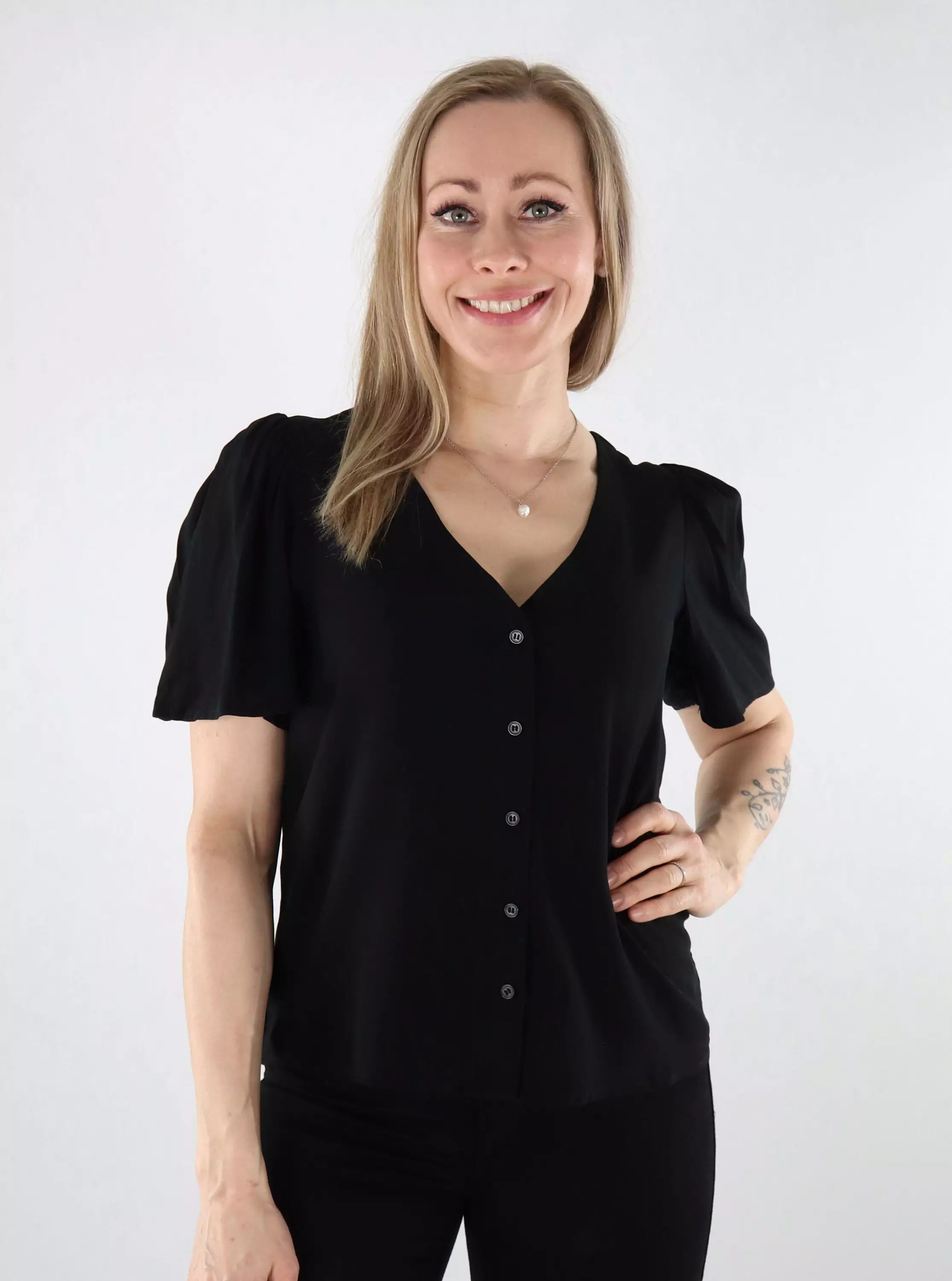 Kevyt t-paita napituksella ja naisellisilla perhoshihoilla. T-paita on valmistettu vastuullisesti tuotetusta LENZING ECOVERO-viskoosista.