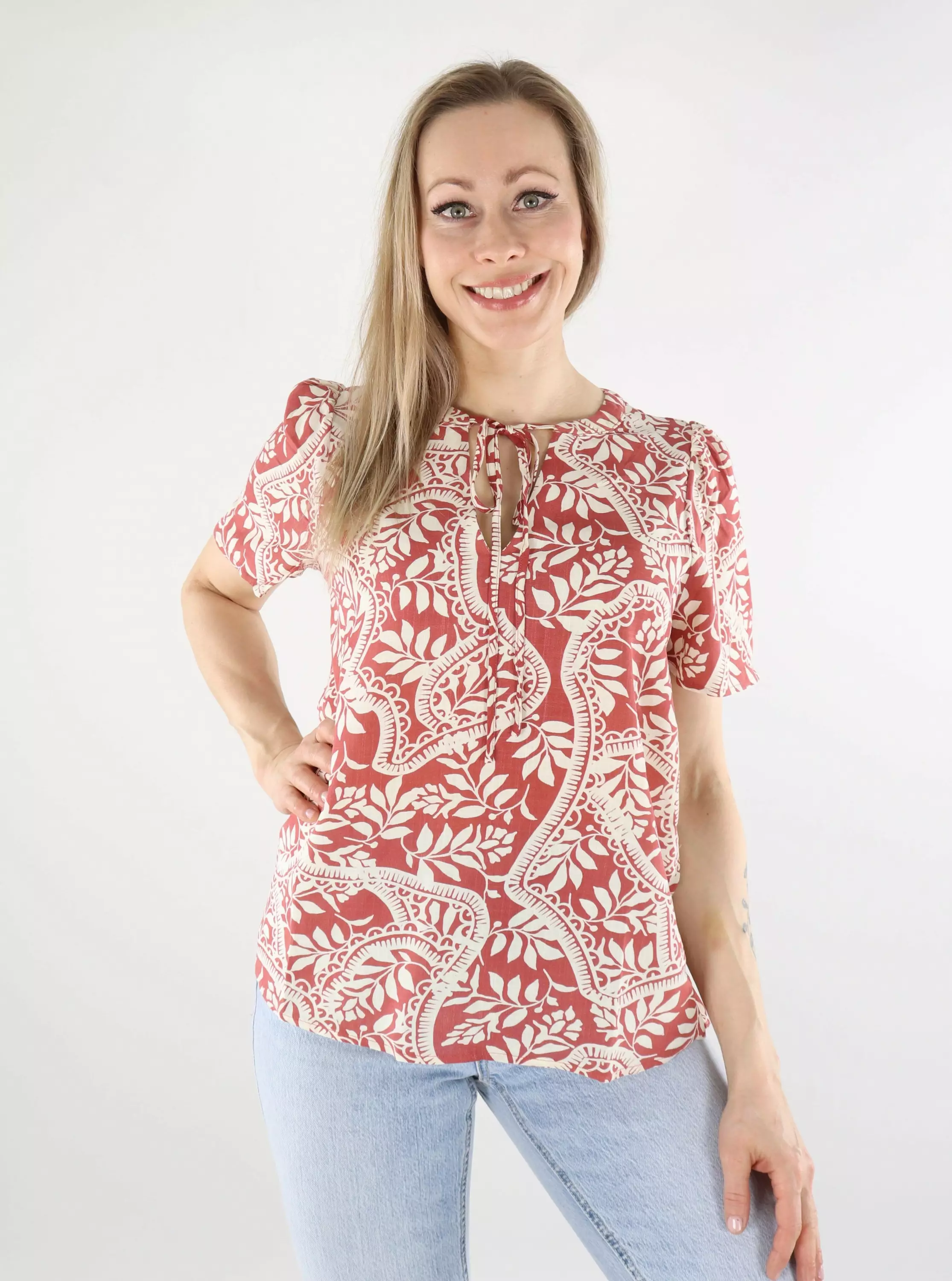 Tämä Vero Modan kuviollinen t-paita on valmistettu ekologisesta viskoosista, joka tuntuu iholla pehmeältä ja hengittävältä. V-pääntie nyöreillä tuo paitaan tyylikkään ja naisellisen yksityiskohdan.
