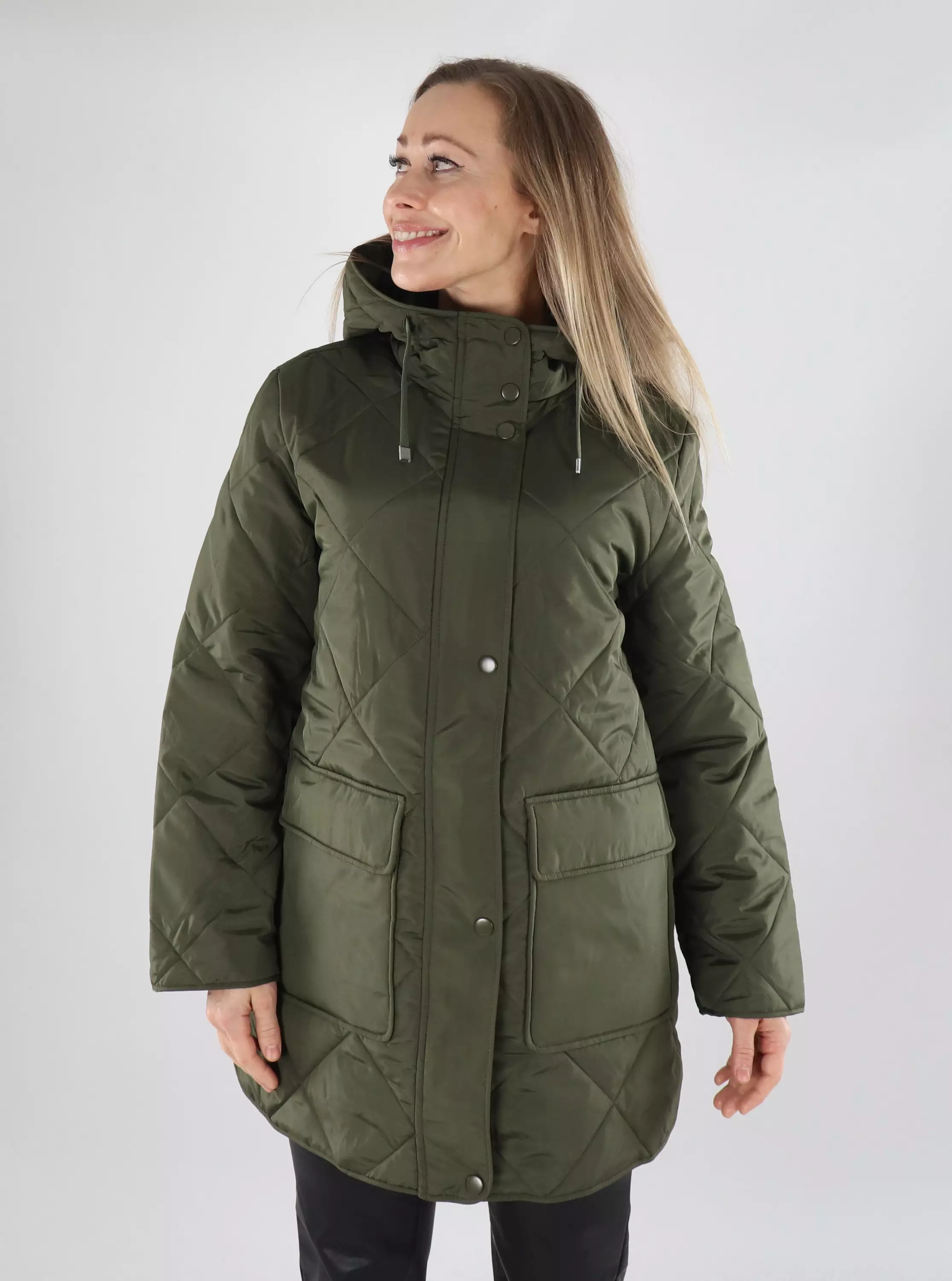 Tyylikäs tikkikuvioitu kevyttoppatakki vetoketjukiinnityksellä ja suurilla etutaskuilla.