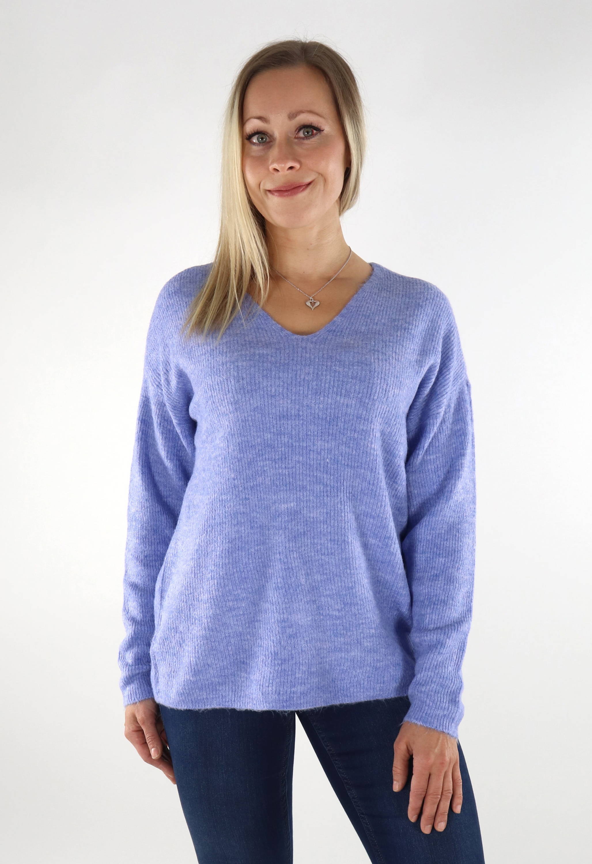 Rennosti istuva lila neule V-pääntiellä.