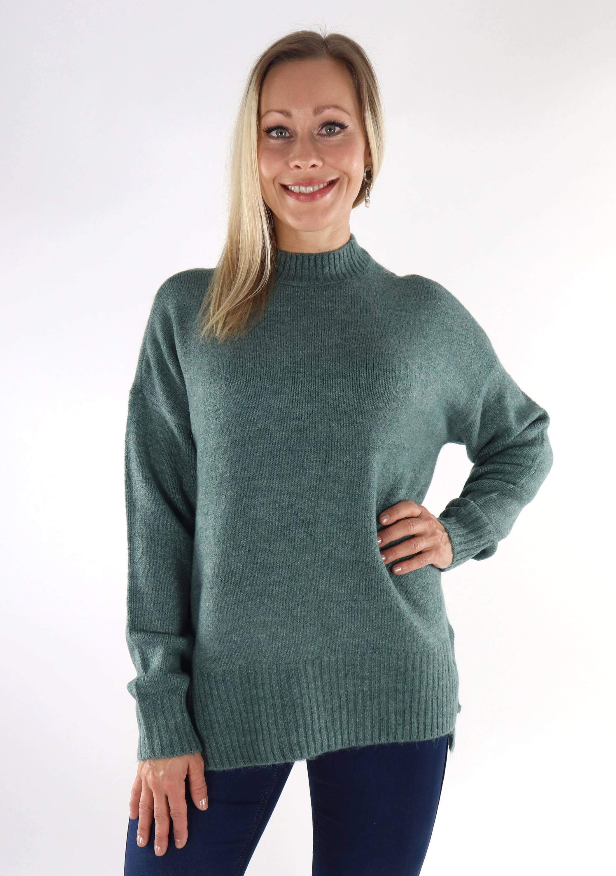 Paksu, lämmin neule halkioilla sekä takaa pidemmällä helmalla