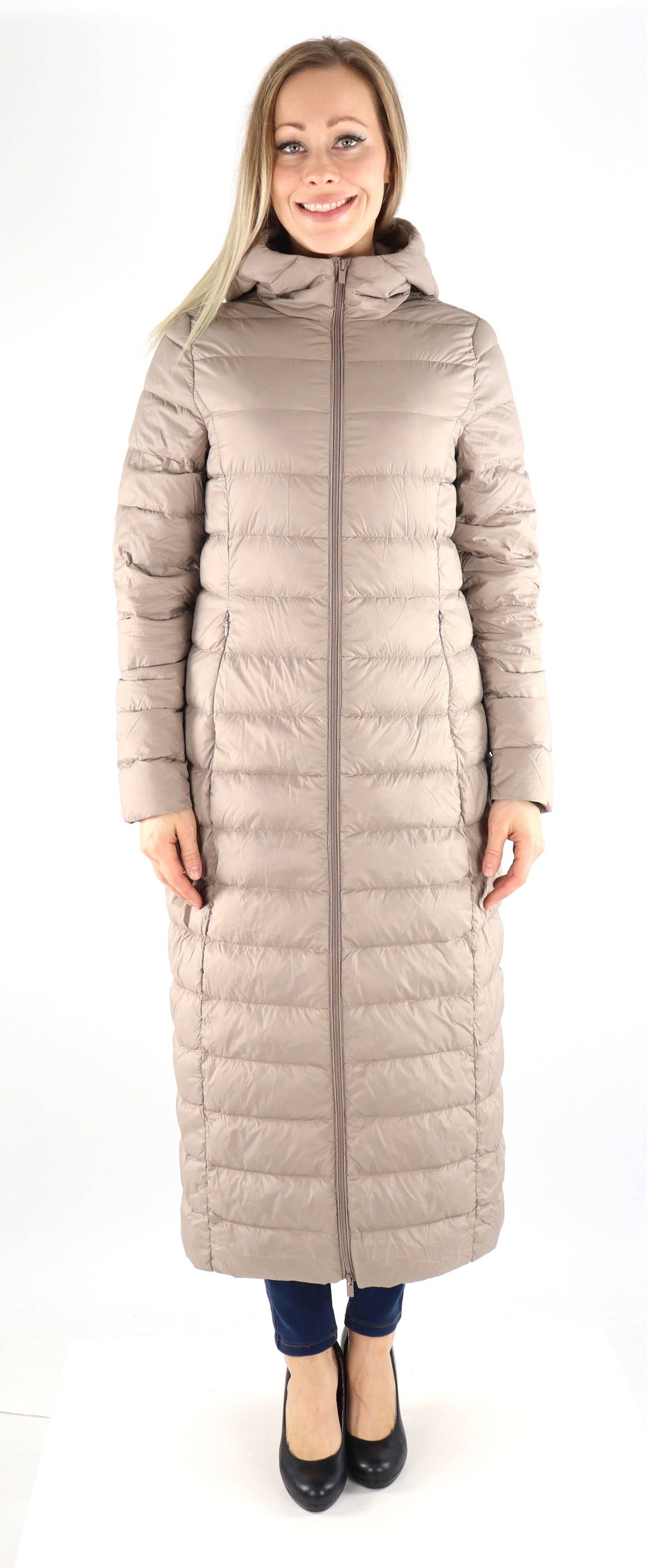 Pitkä untuvatäytteinen takki kaksisuuntaisella vetoketjulla sekä vetoketjutaskuilla.