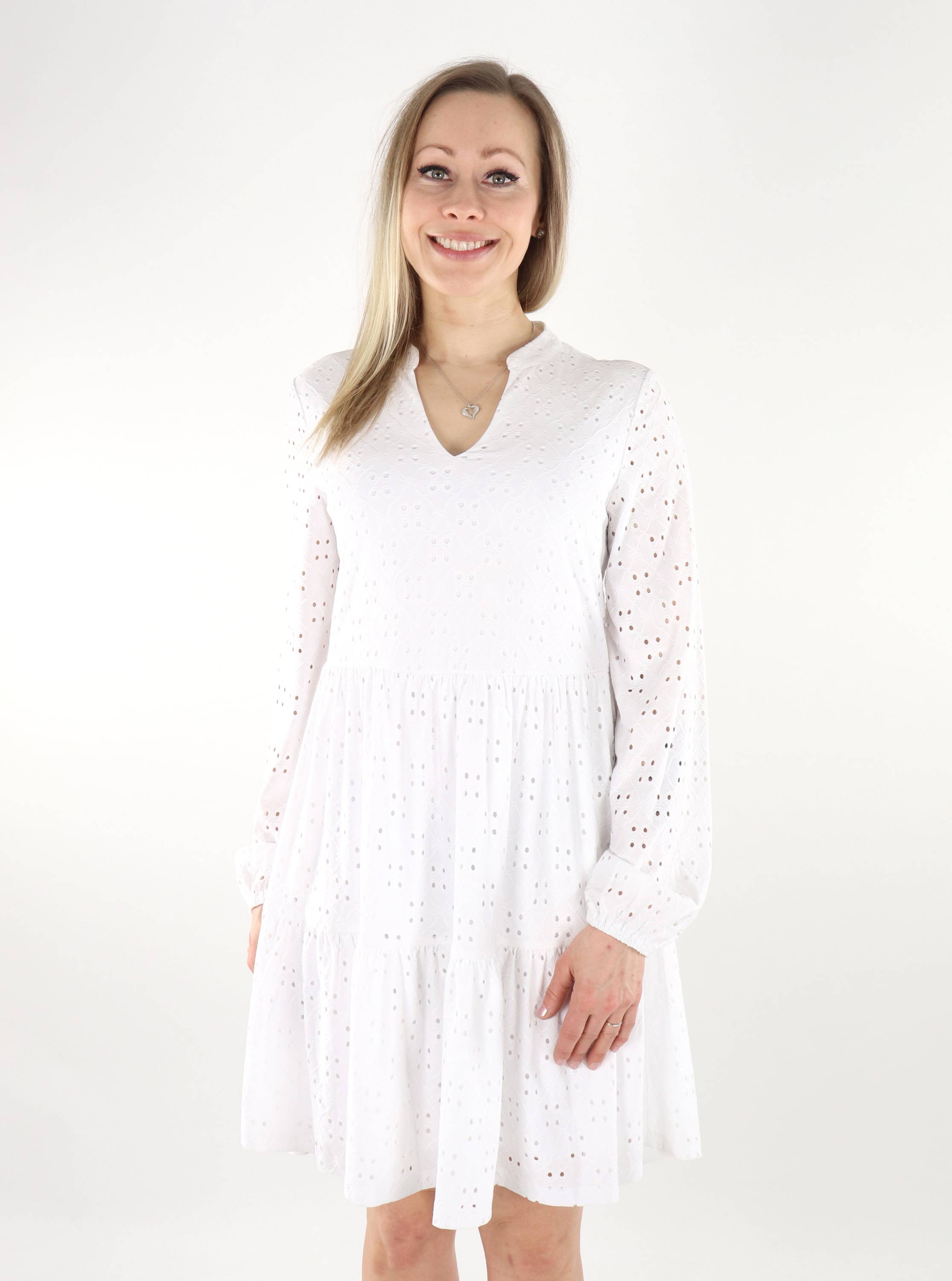 Kirjailtu ja reikäkuvioitu mekko poimutetulla helmalla.