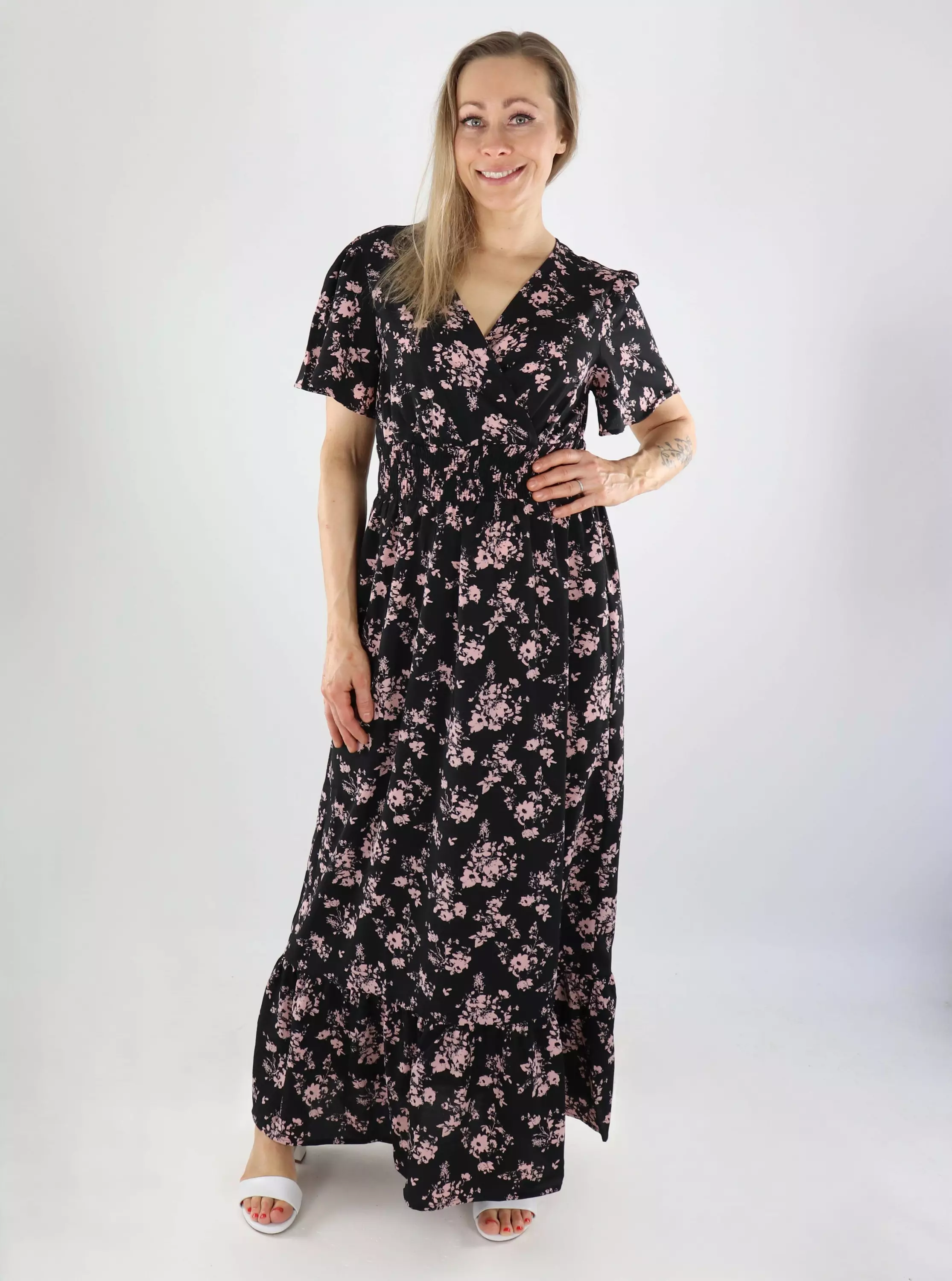 Kevyt ja naisellinen mekko kukkakuvioinnilla. Ilmava materiaali tuntuu miellyttävältä päällä ja laskeutuu kauniisti. Helppo valinta arkeen ja juhlaan!