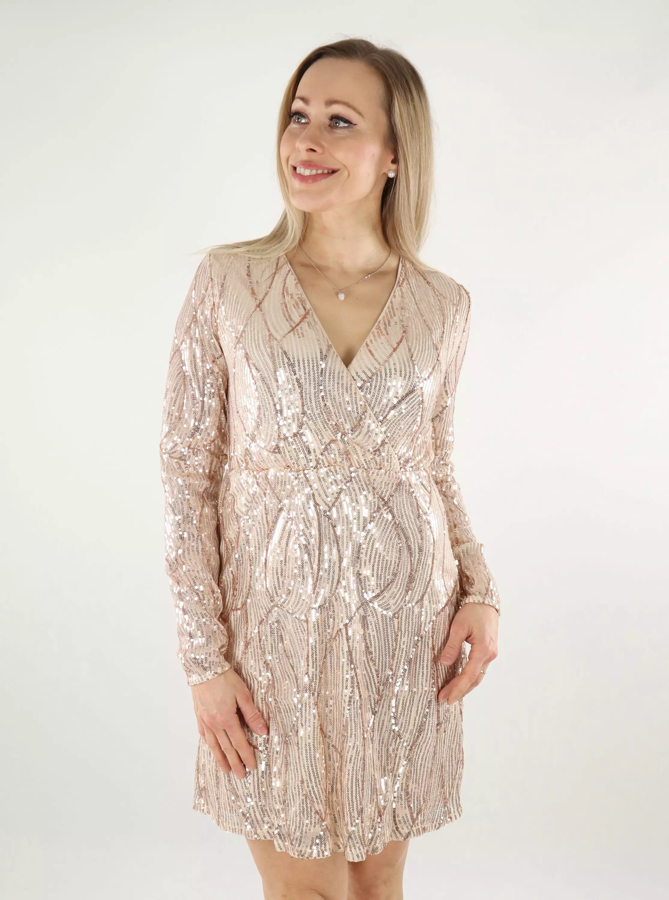Vilan näyttävä paljettimekko, jossa kietaisumallinen yläosa.