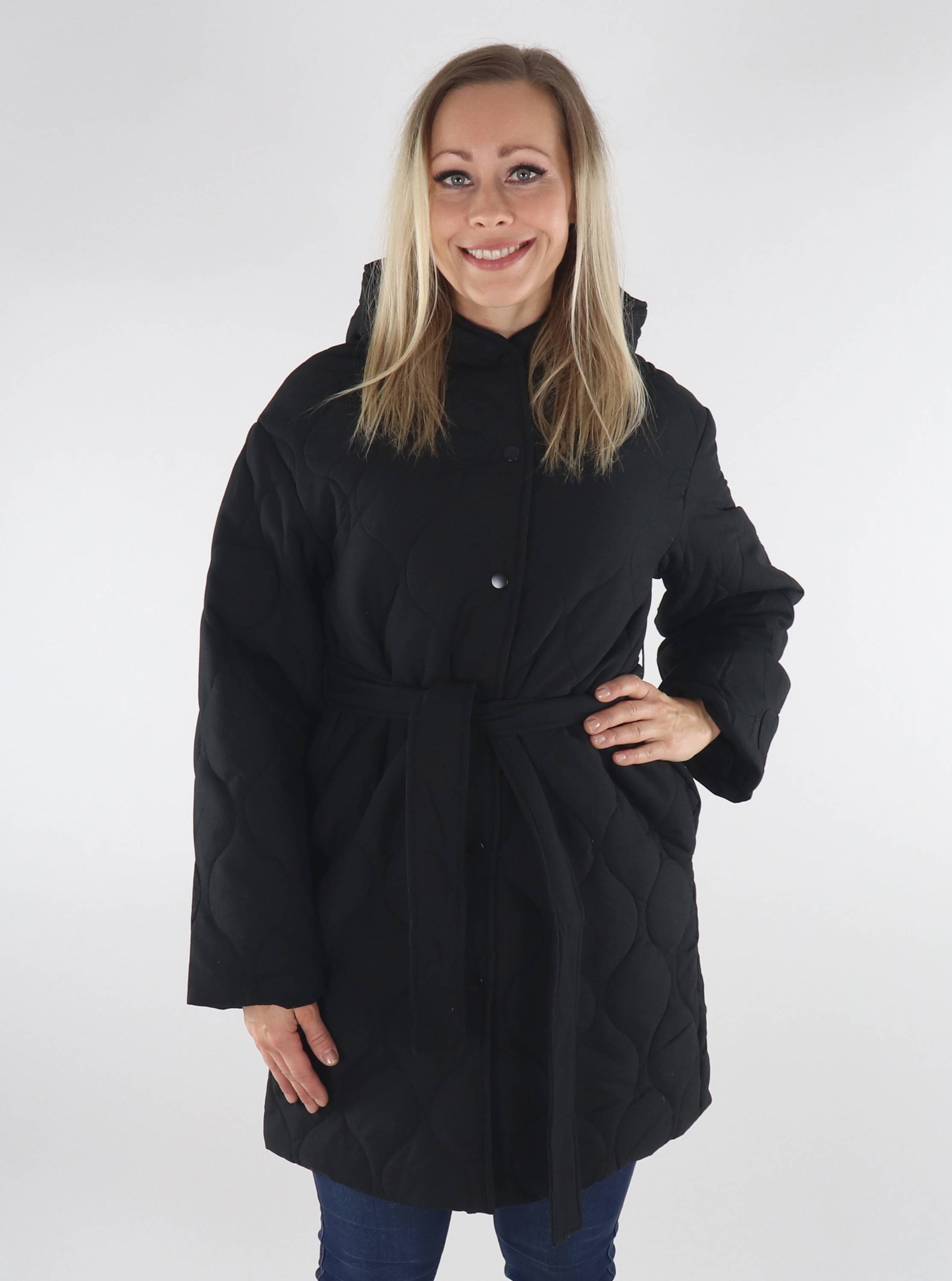 Hupullinen tikkitakki irrotettavalla kangasvyöllä.