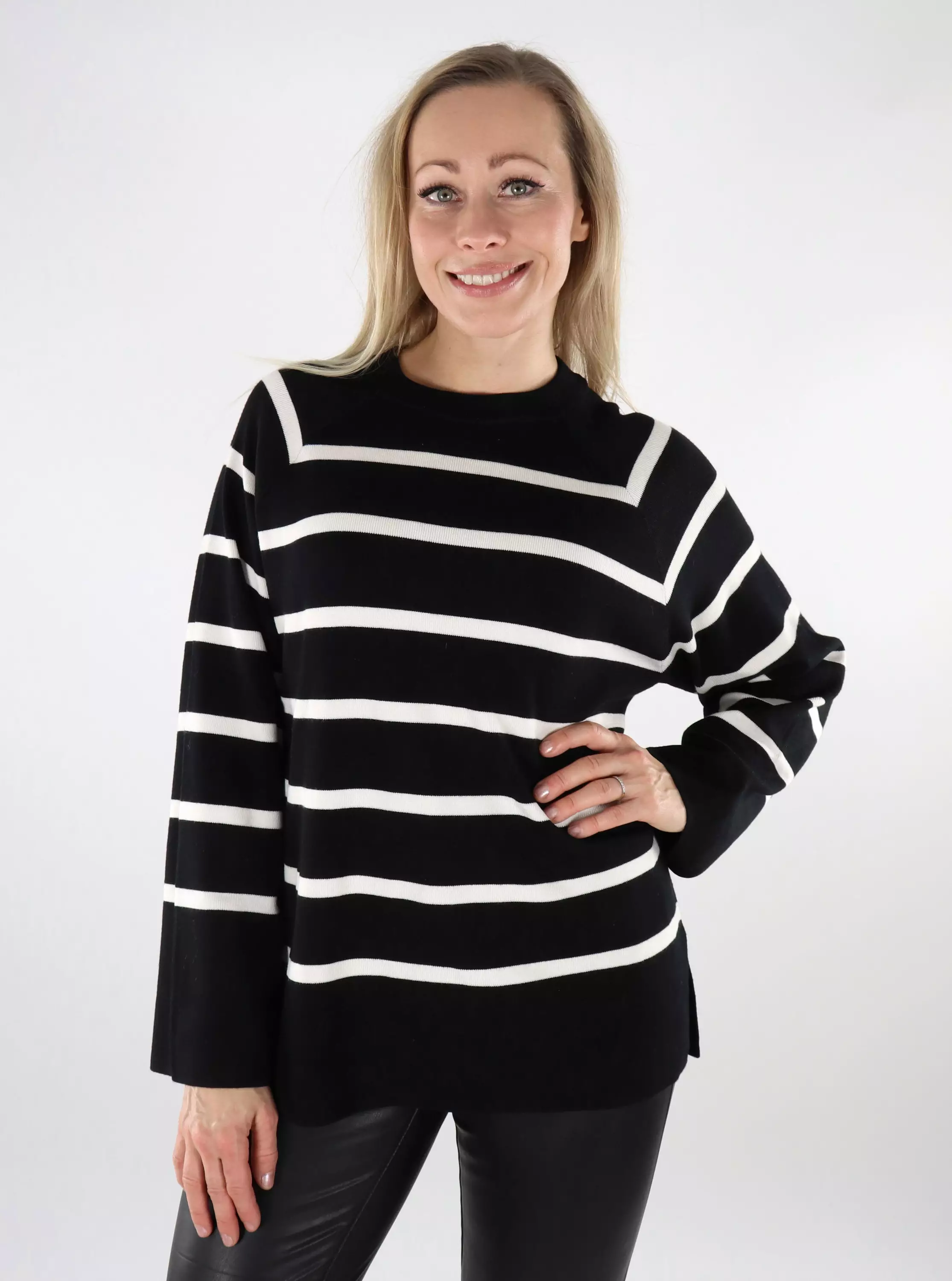 Dammodell, randig tröja med slitsar på sidorna. Något bredare muddar kompletterar denna trendiga tröja perfekt!