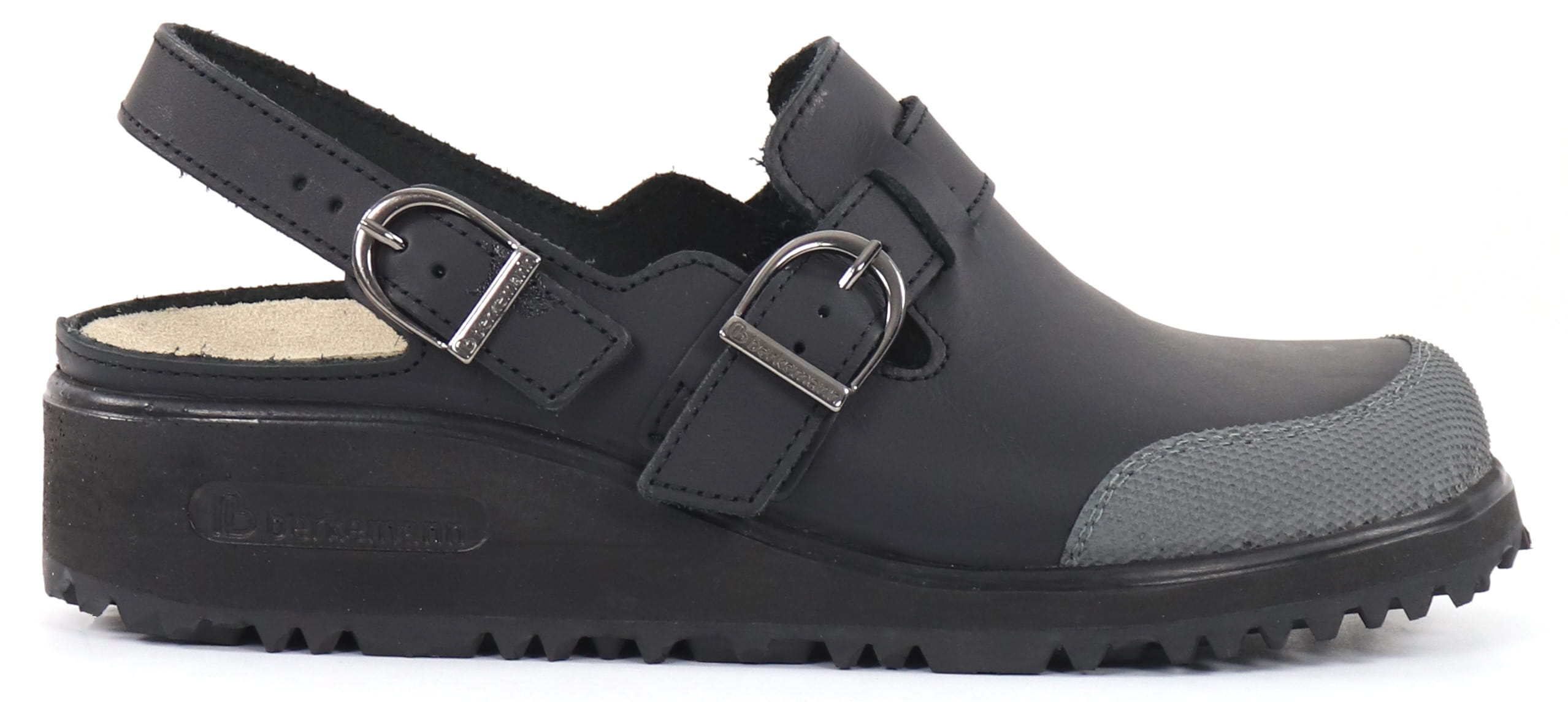 Arbetsskor med fast tådel och justerbar remmar. Skyddskåpan på framsidan av foten förhindrar läderskador.