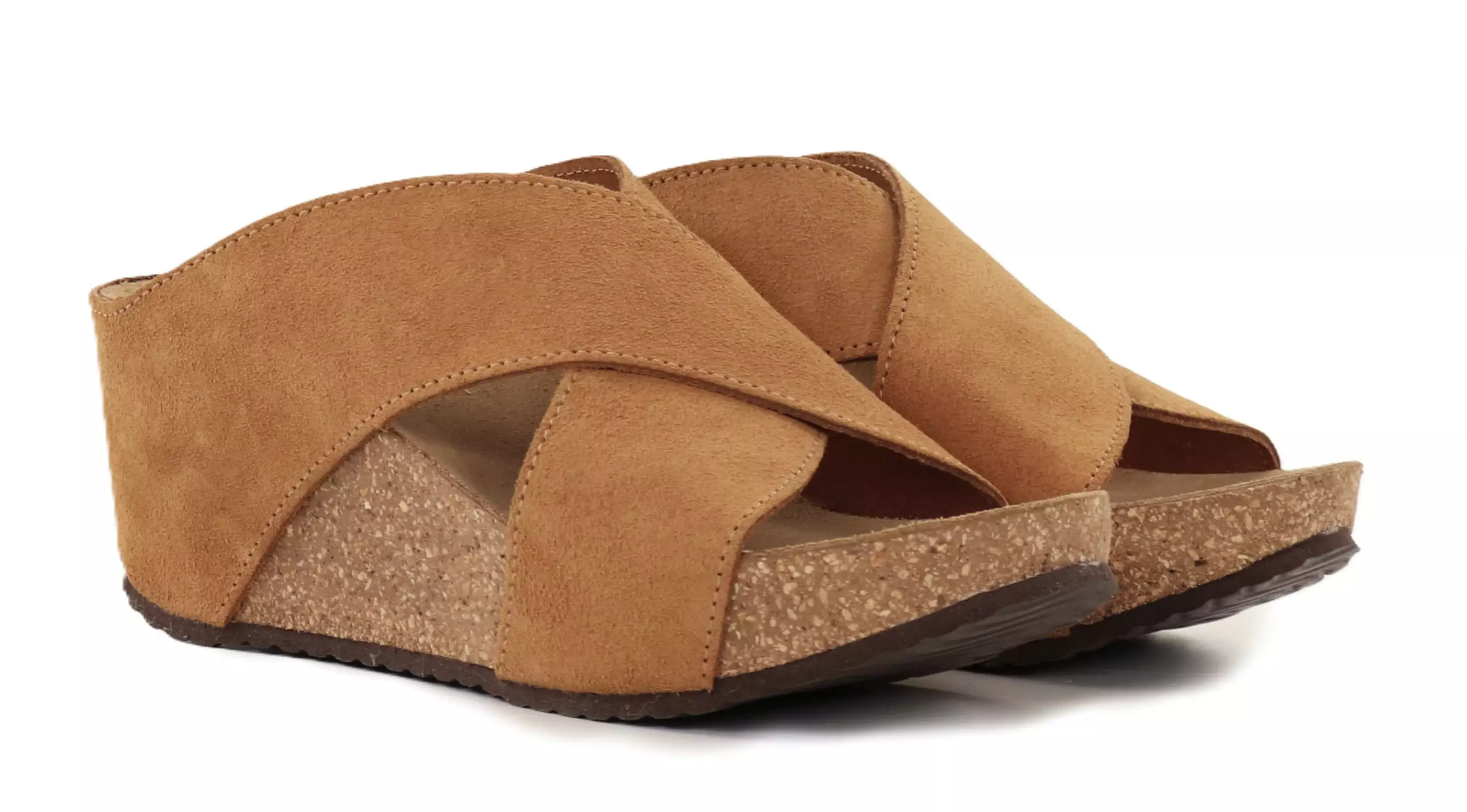 Copenhagen Shoes cognacbruna mulor ger elegans till varje outfit! Äkta mocka, kilklack och korksula kombinerar komfort och stil. Dessa skor är perfekta för både vardag och vardagliga fester!