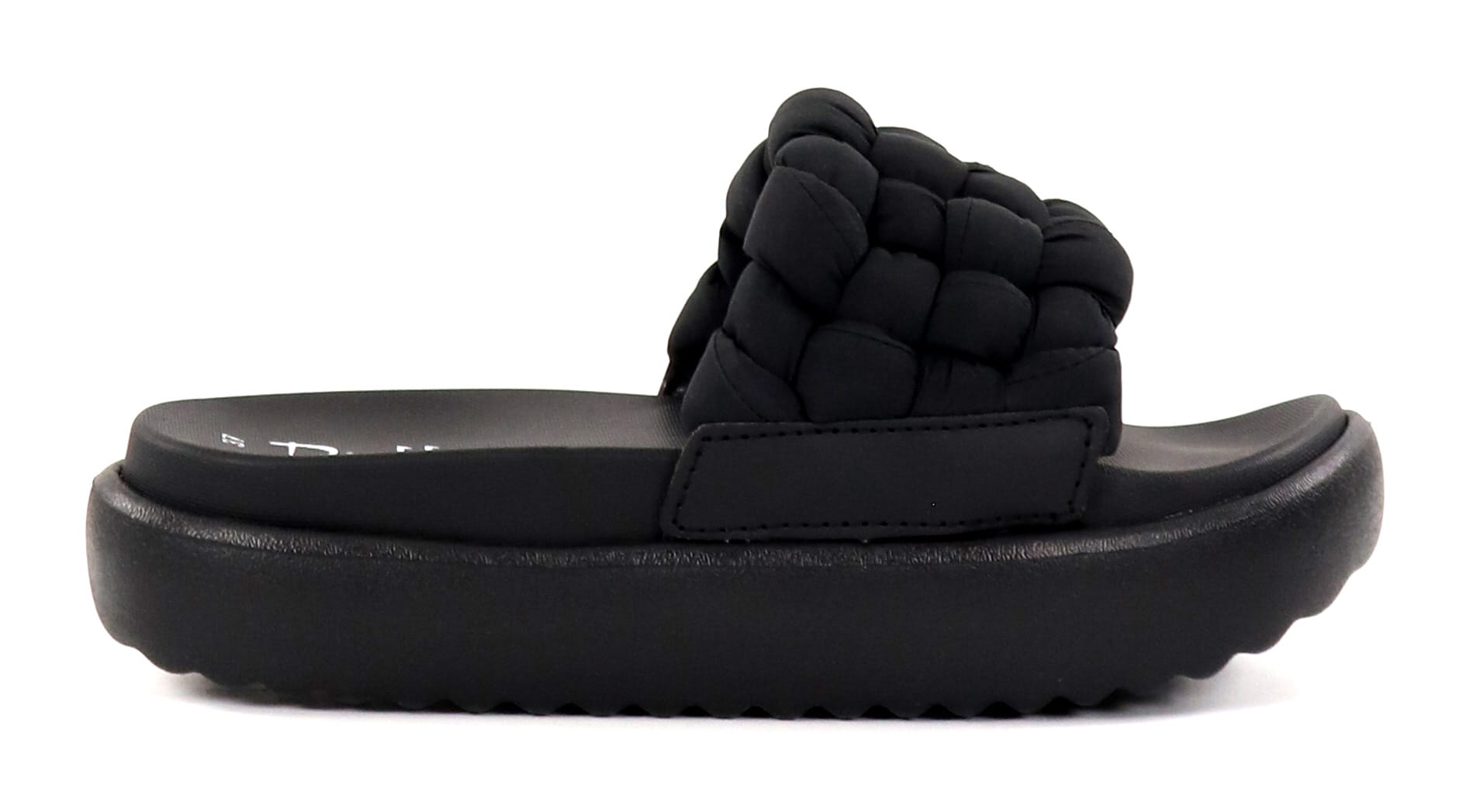 Tjocksulade slip-in sandaler med flätat tygöverdrag.
