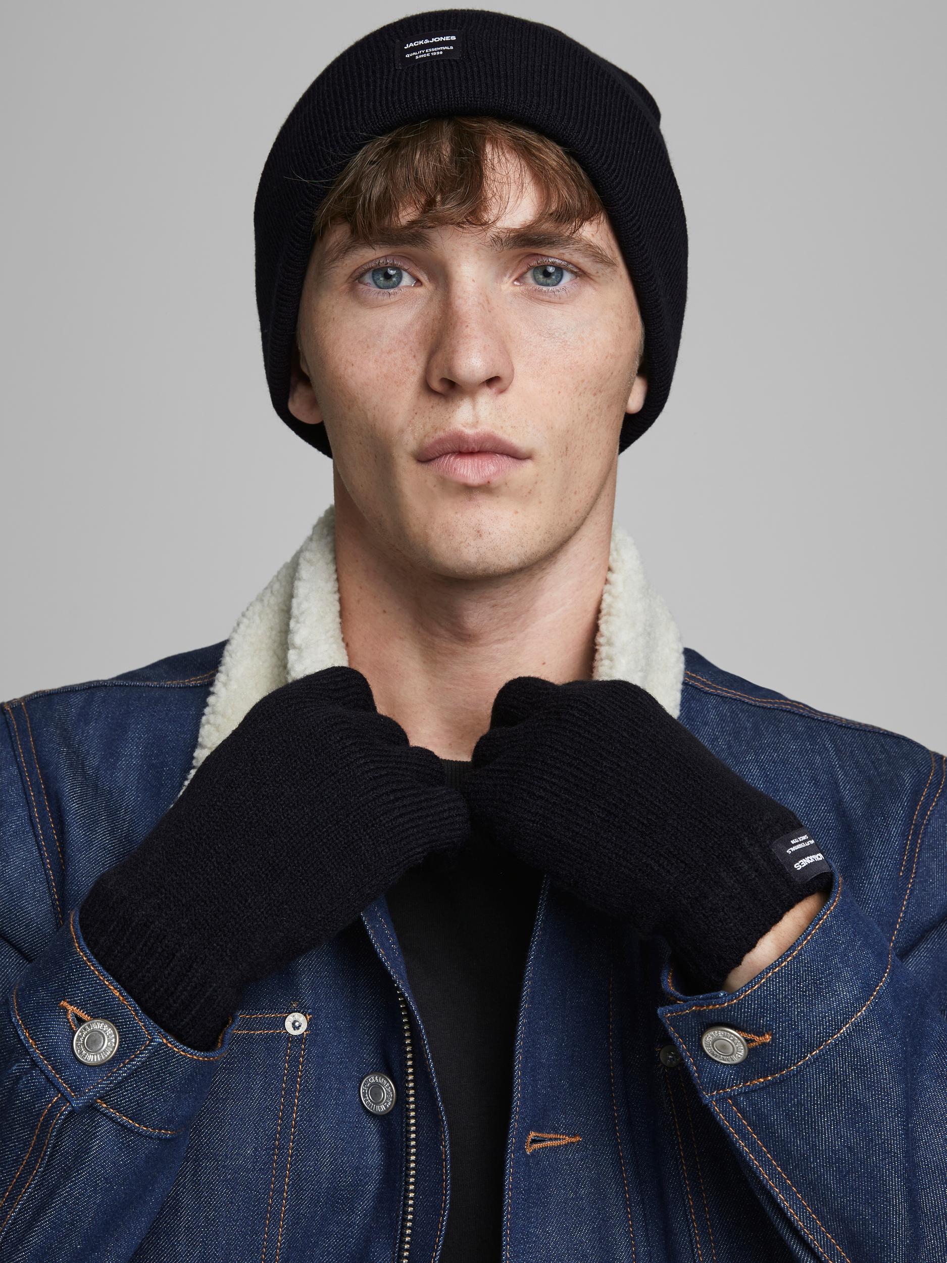 Stickad mössa i en storlek för män och handskar i presentförpackning.