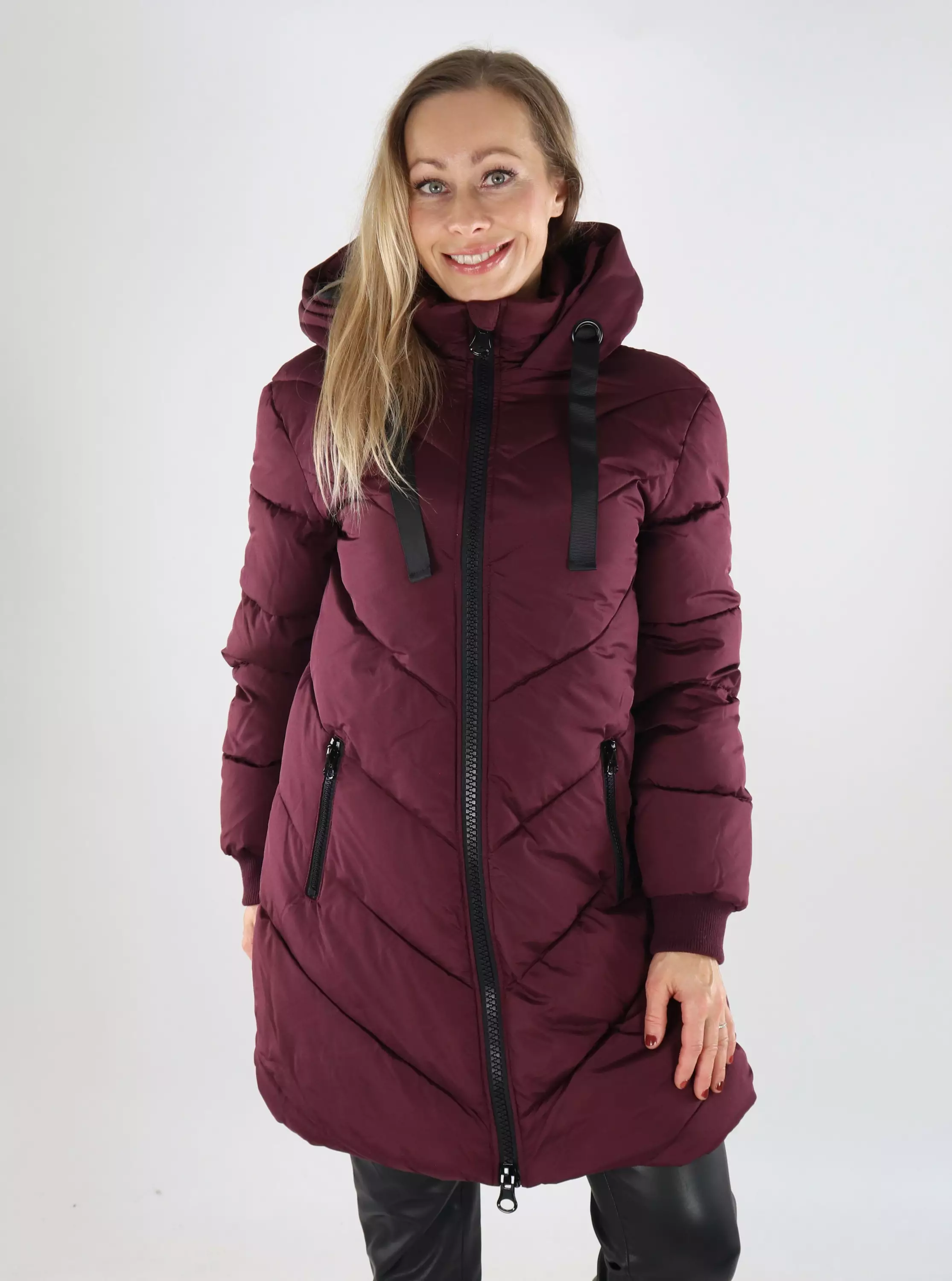 Varm och vadderad damjacka med hög krage och tvåvägsdragkedja.