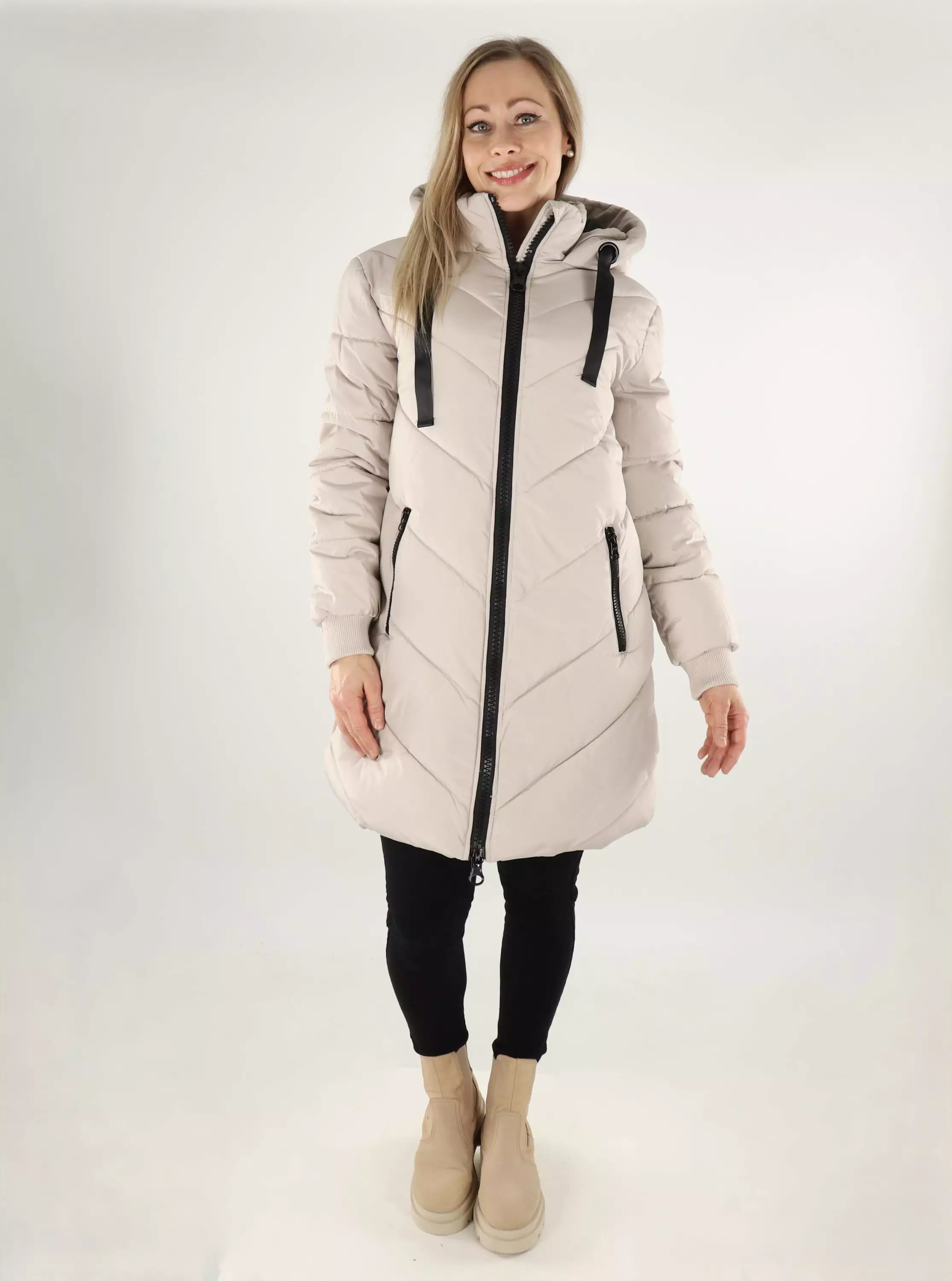 Varm och vadderad kappa med hög krage för kvinnor med tvåvägs dragkedja.