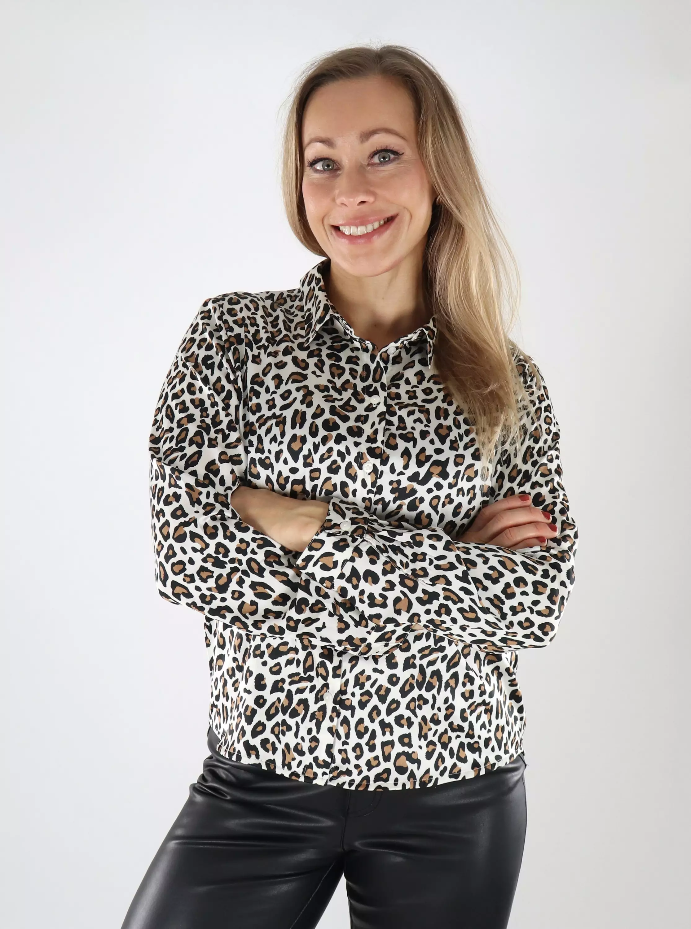 En skjorta tillverkad av ett lätt och glansigt material med ett trendigt leopardmönster. En mångsidig modell som passar både för vardagslivet och mer eleganta situationer.