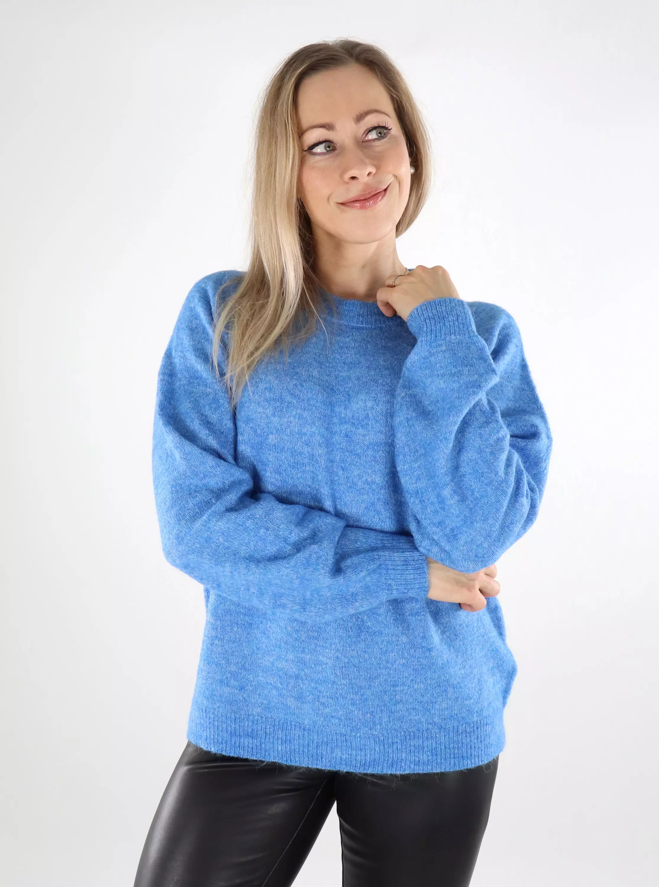 En klassisk tröja i en fräsch blå ton. Materialet innehåller alpacka och fårull, så det är riktigt mjukt och varmt!