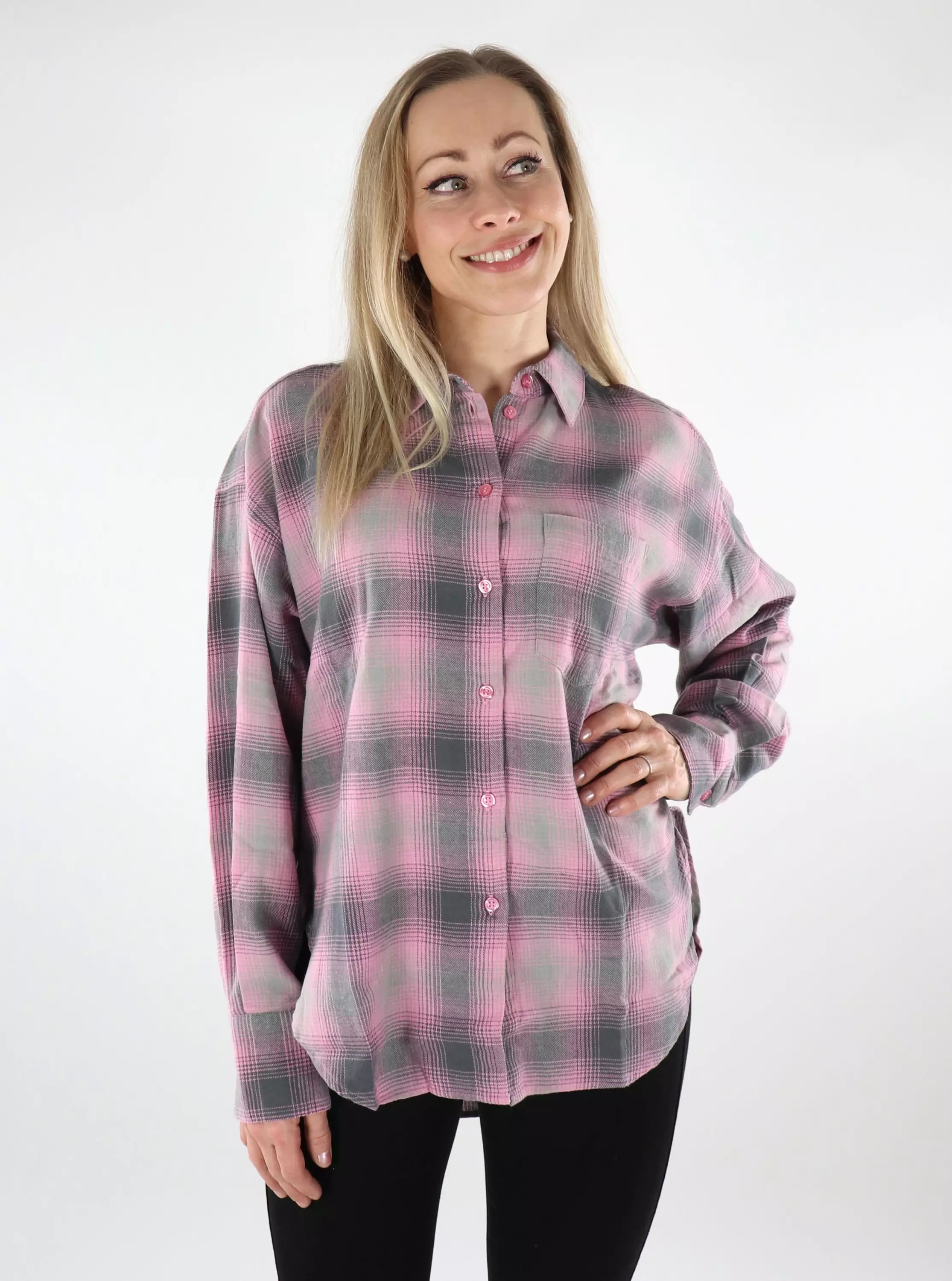 En rutig, avslappnad klädselskjorta med en rundad och något längre fåll baktill.