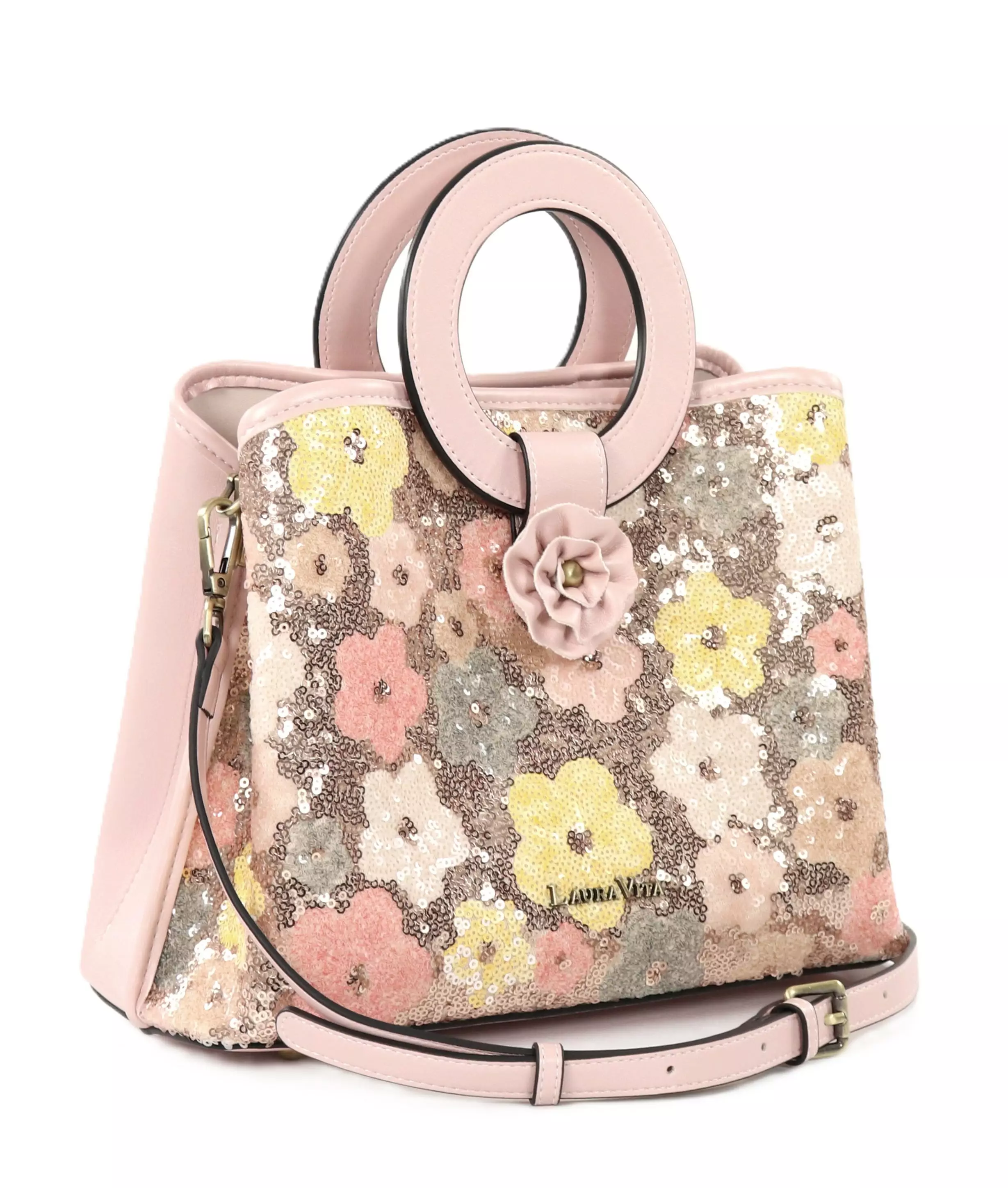 Lägg till färg och stil till din outfit med Laura Vitas axelväska, med en slående paljetttopp och feminina blommiga detaljer. Den avtagbara axelremmen gör väskan mångsidig: du kan bära väskan på axeln eller armen beroende på situationen!