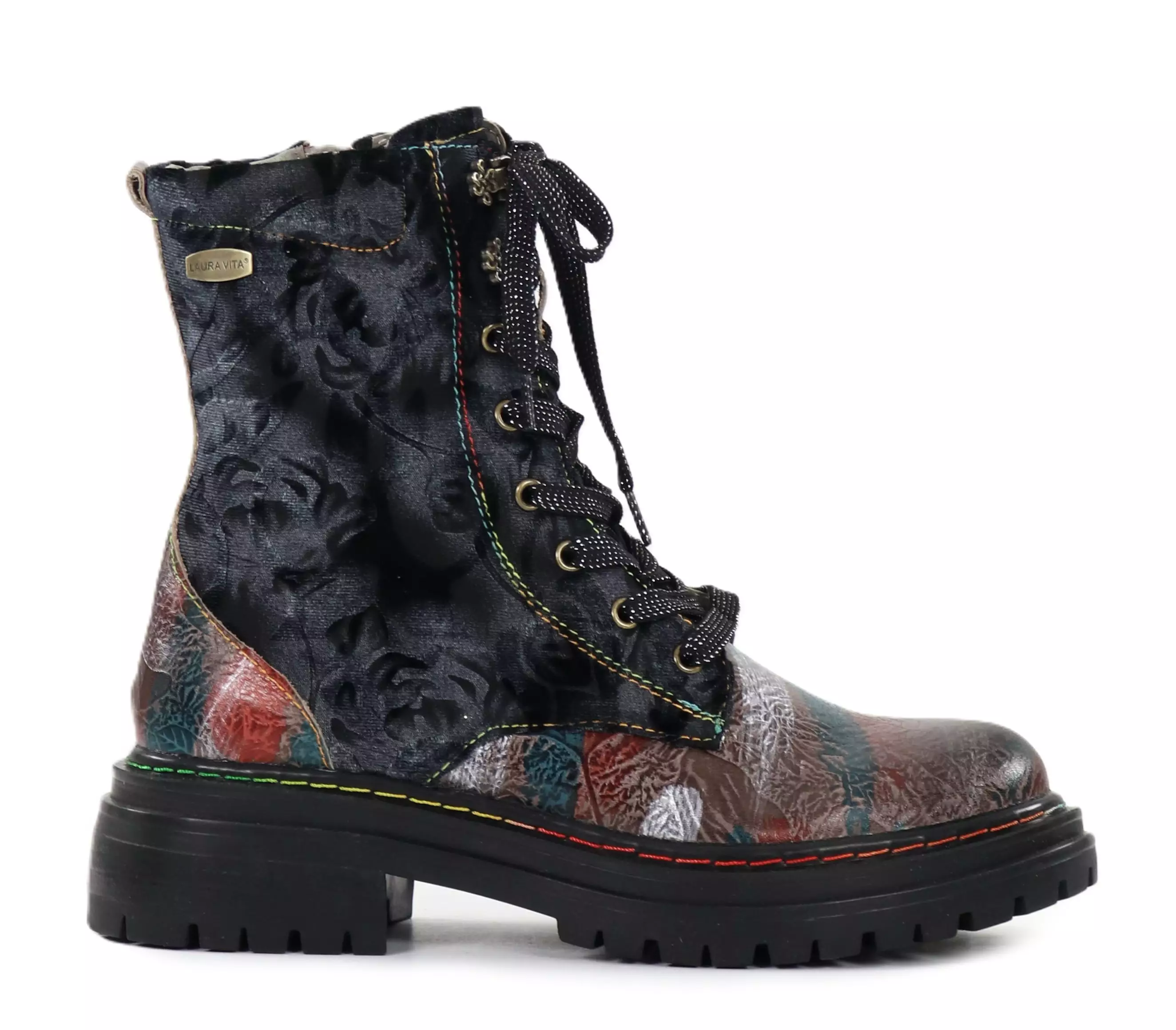 Personliga Laura Vita ankelboots kombinerar robustheten hos en stridsstövelmodell med slående mönster. Högkvalitativt lädermaterial och detaljerad design gör dessa skor till ett riktigt blickfång. Det perfekta valet när du vill sticka ut med stil!