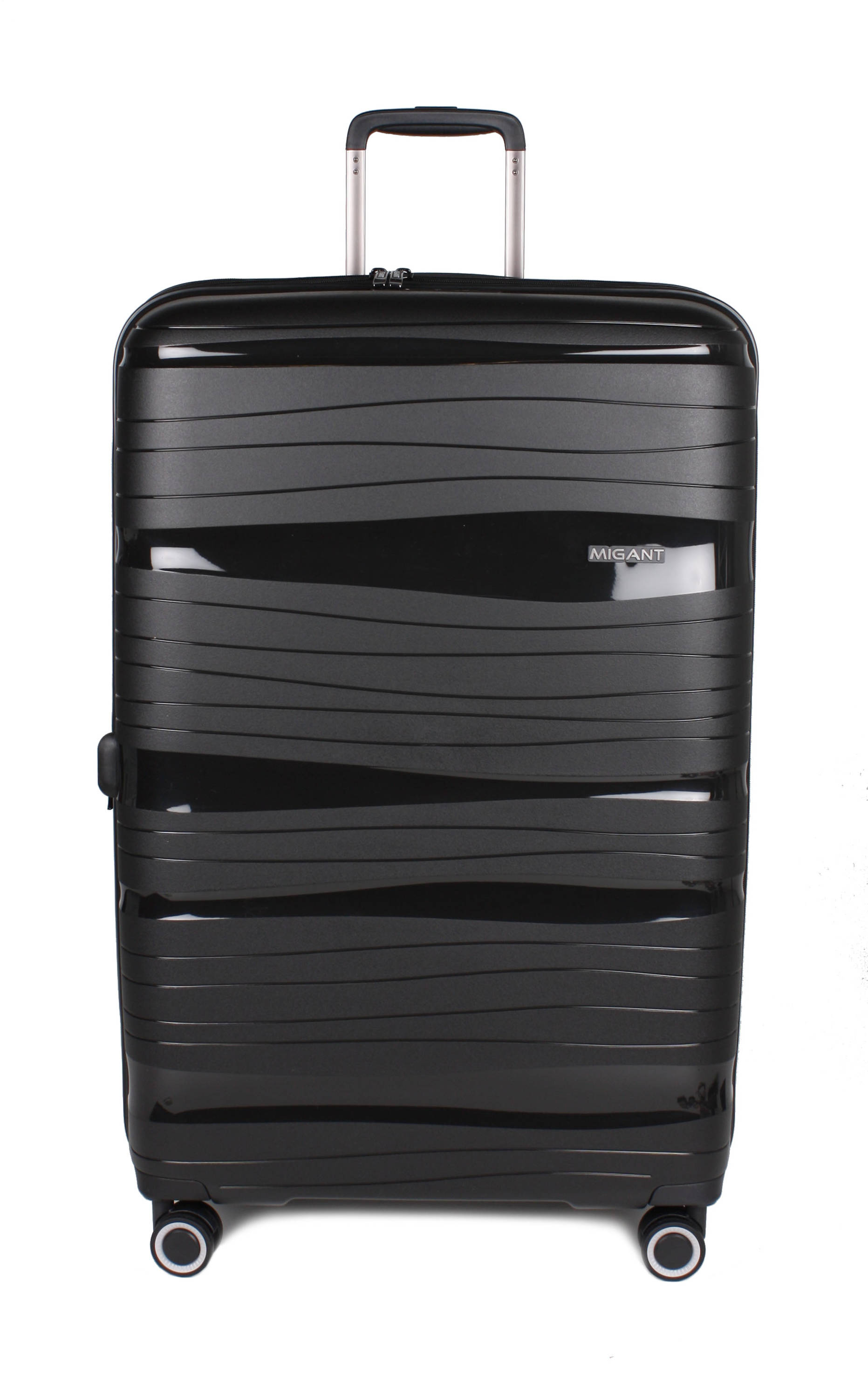 Migants högkvalitativa resväska av polypropen, som är lätt, praktisk och lättrullad med sina fyra dubbla hjul.