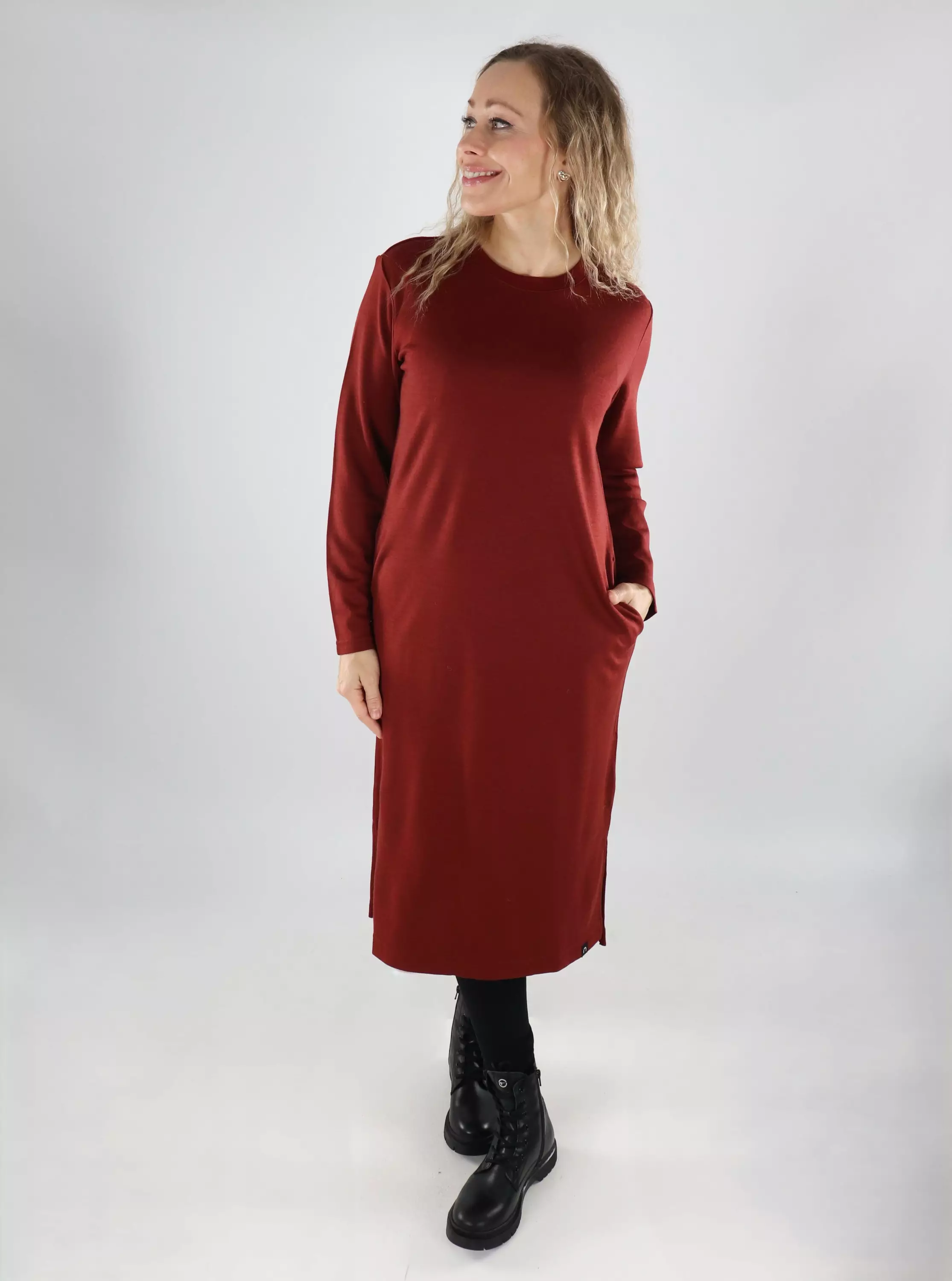 Den mångsidiga klänningen är ett enkelt och snyggt val för vardagsbruk. Den raka, vadlånga modellen med långa ärmar och sidofickor passar både för kontor och fritid. Klänningen har en ribbad halsringning och slitsar på sidorna. Den bekväma merino-bambustickningen kombinerar merinoullens andningsförmåga och bambuviskosens mjukhet - känns bra hela dagen.