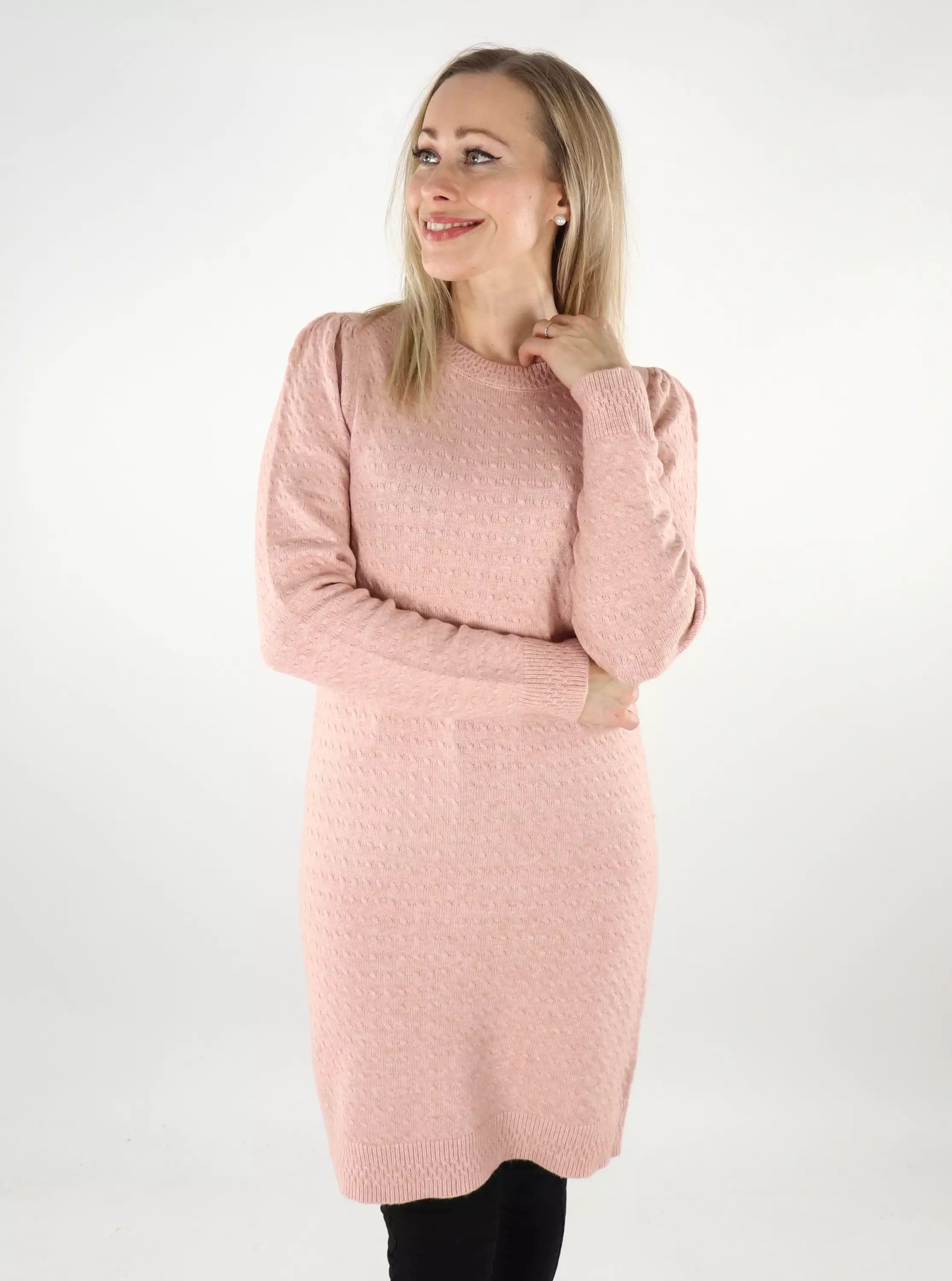 En vacker stickad klänning med mönstrad stickad yta och rund halsringning. Kombinera med leggings eller tjocka tights, så får du enkelt en snygg och bekväm outfit!
