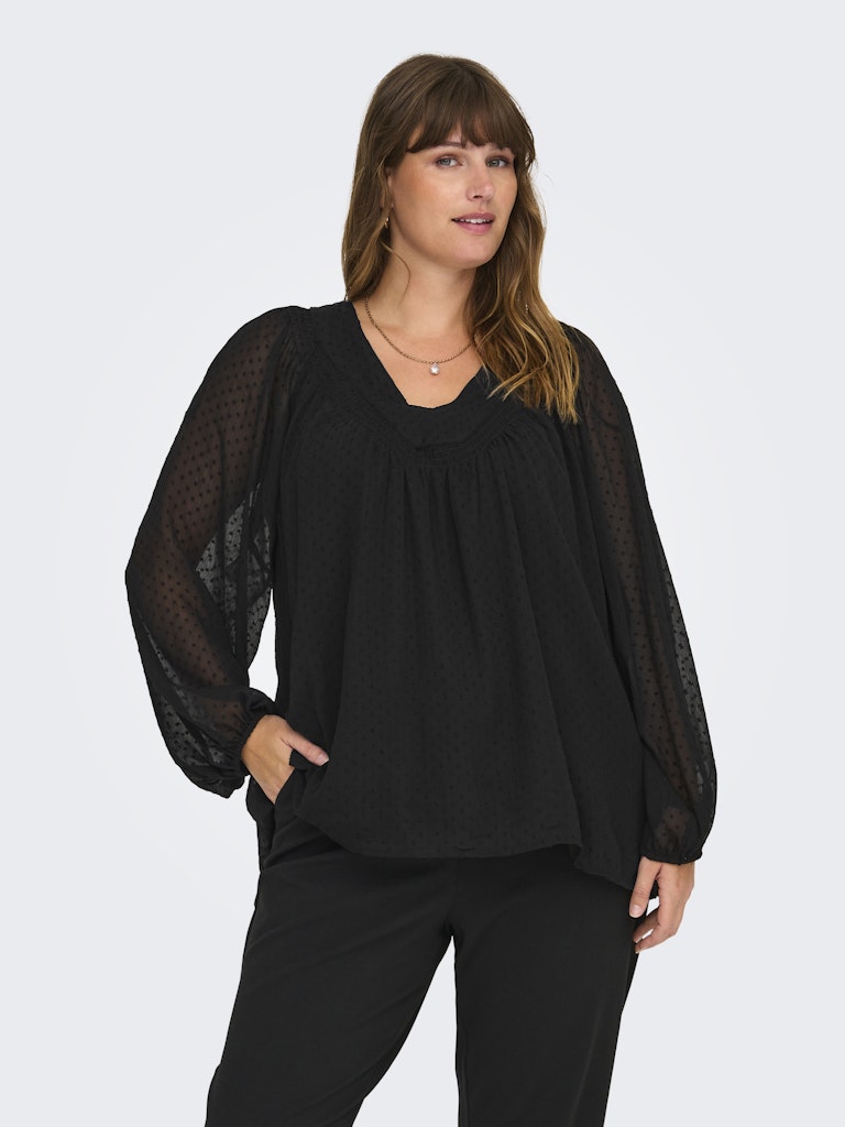 En vacker plus size skjorta med V-ringning och genomskinliga, avslappnade ärmar.