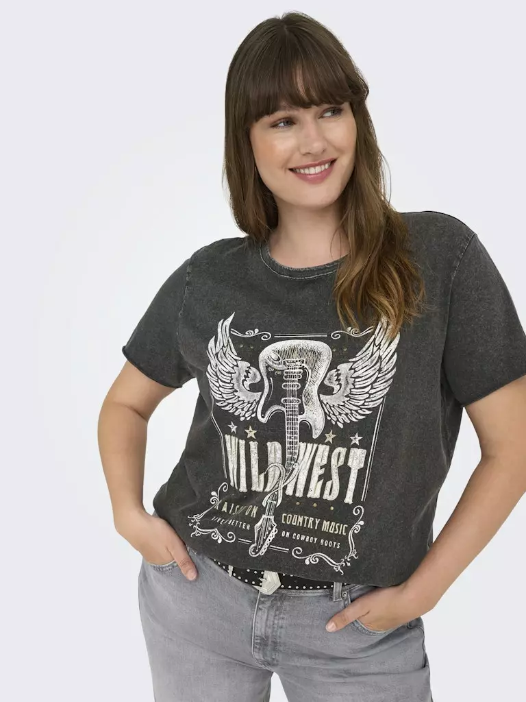 En snygg plus size t-shirt tillverkad av mjuk ekologisk bomull och avslutad med ett slående tryck med slående strassstenar. Ett bekvämt och ansvarsfullt val för vardagskläder – med en touch av glitter.