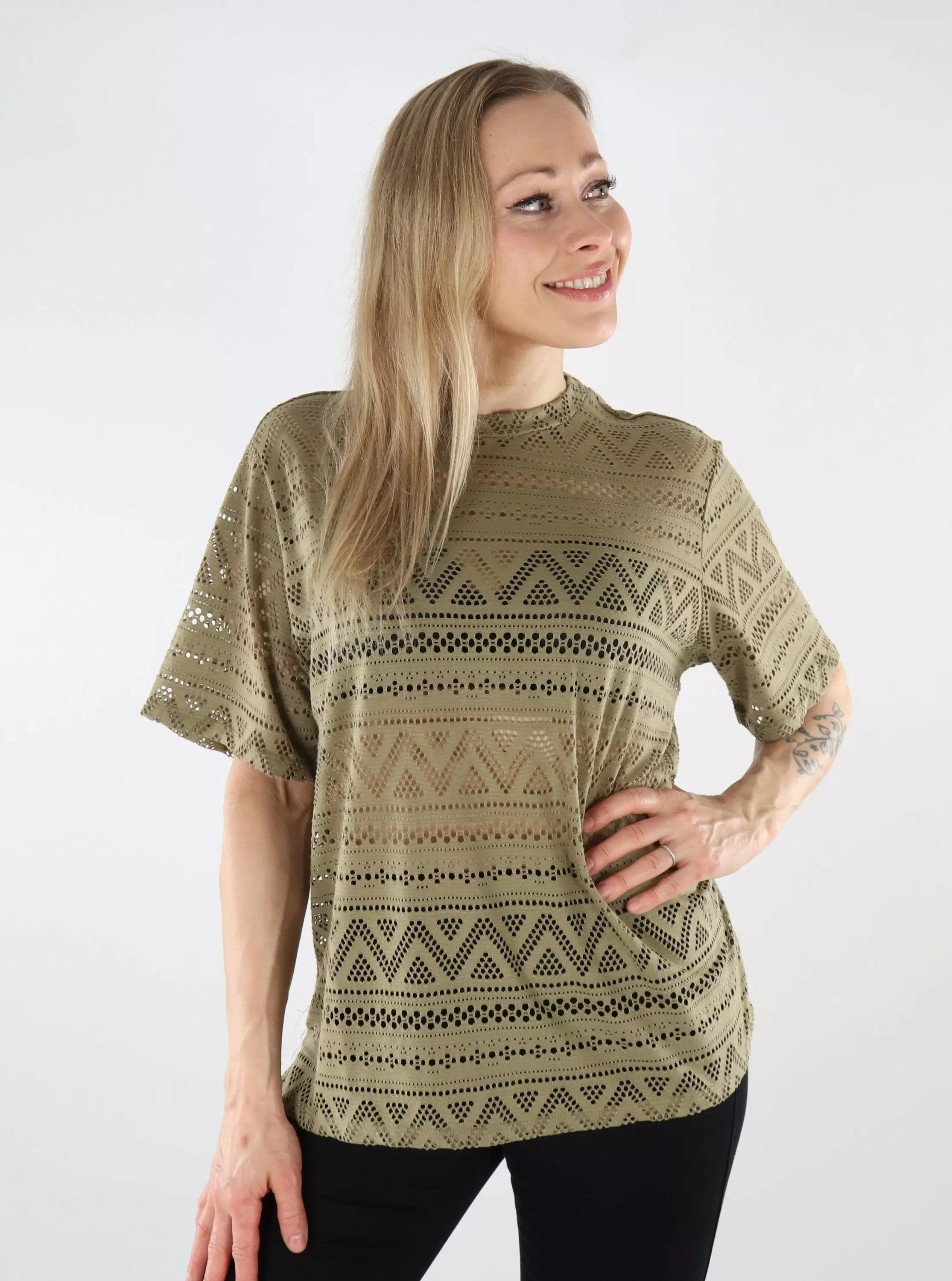 Denna Only-t-shirt kombinerar ett trendigt spetsmönster med bekväm elasticitet. Ett enkelt val när du vill se snygg ut avslappnat!