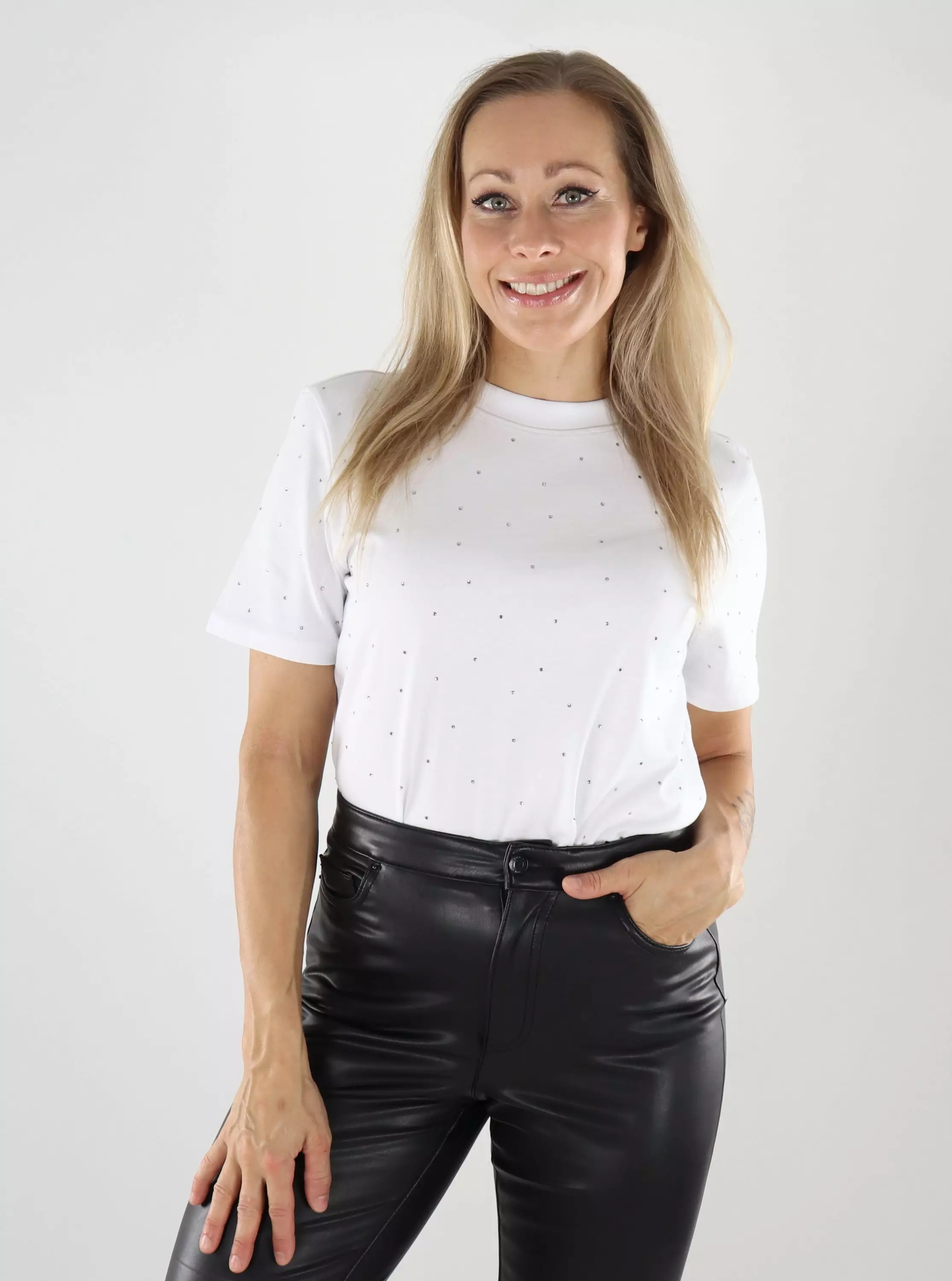 Denna Only t-shirt kombinerar tidlös stil med en touch av glitter! Den klassiska skärningen säkerställer en bekväm passform, och de glittrande strassdetaljerna på framsidan ger en touch av glamour till outfiten. Perfekt för vardagsbruk eller när du vill ge din outfit lite festlig touch.