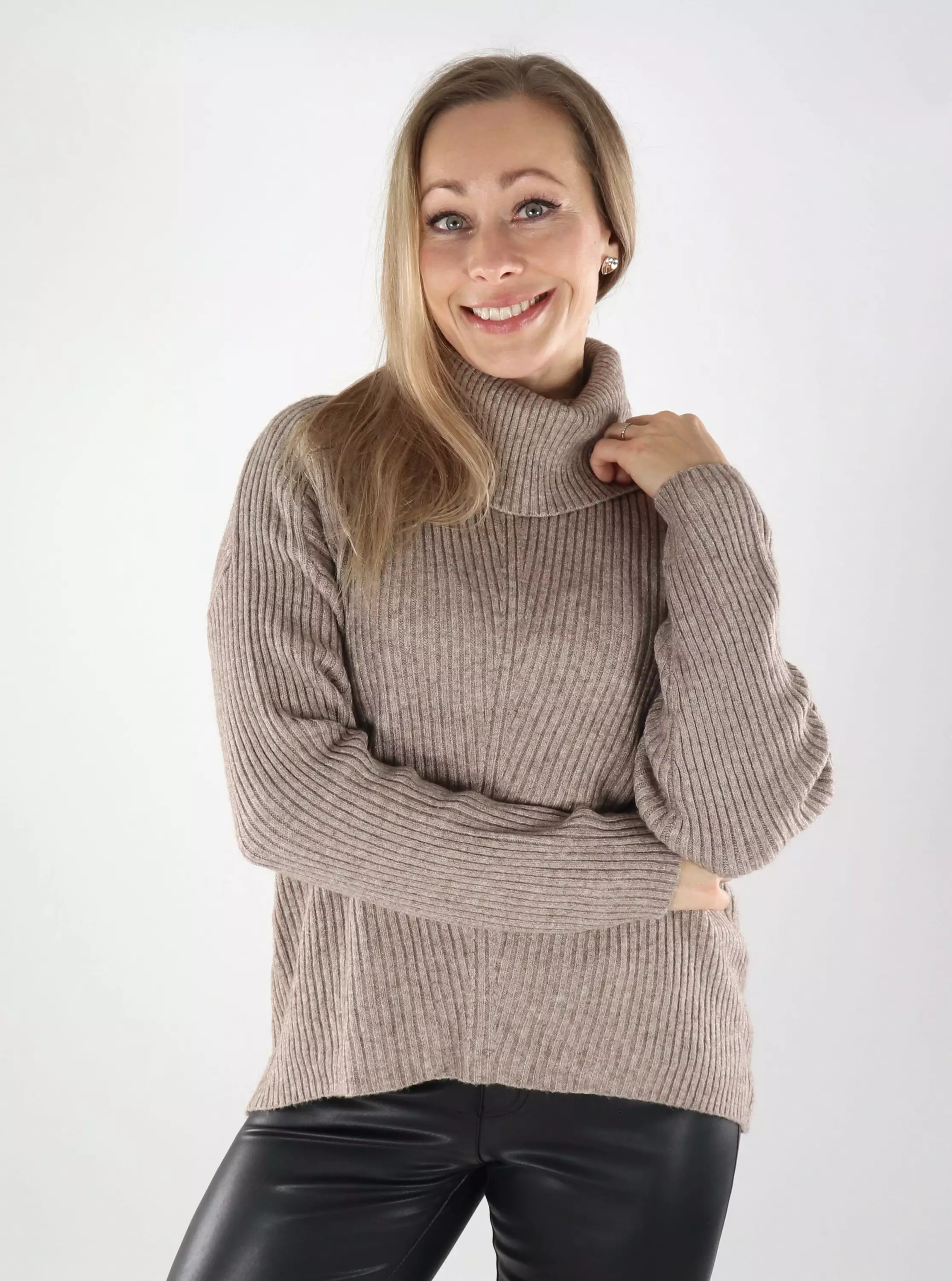 Mjuk stickning med hög halsringning. Något längre nederkant baktill.