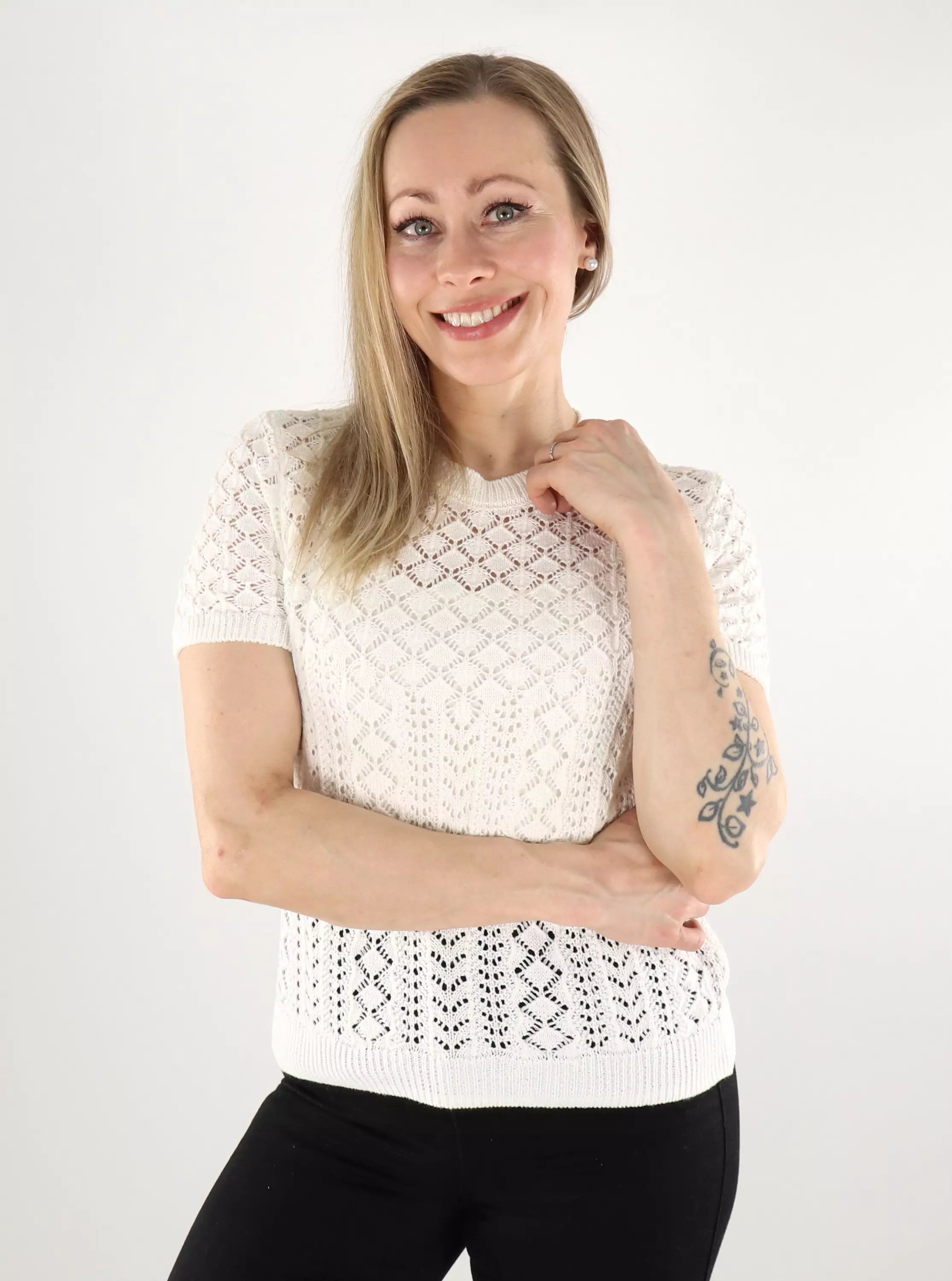En t-shirt gjord av en vacker spetsmönstrad sticka. Materialet i skjortan är en återvunnen bomullsblandning, som känns bekväm och andas på huden.