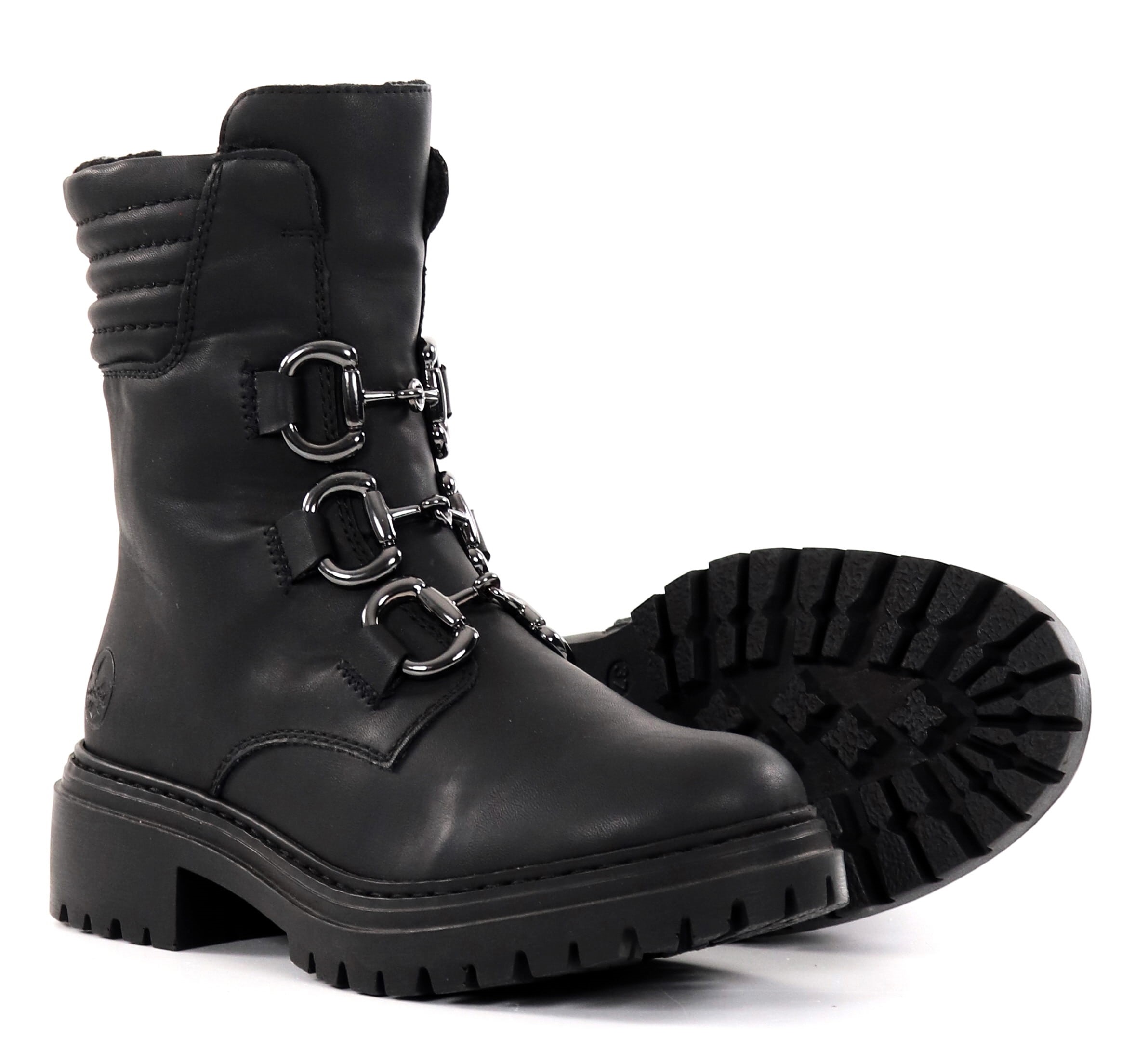 Underbara Rieker Ankelboots med spektakulära spänndetaljer! Trots sitt utseende är den något tjockare sulan bekvämt flexibel. Dragkedjan på insidan gör det snabbt och enkelt att ta på sig skorna!