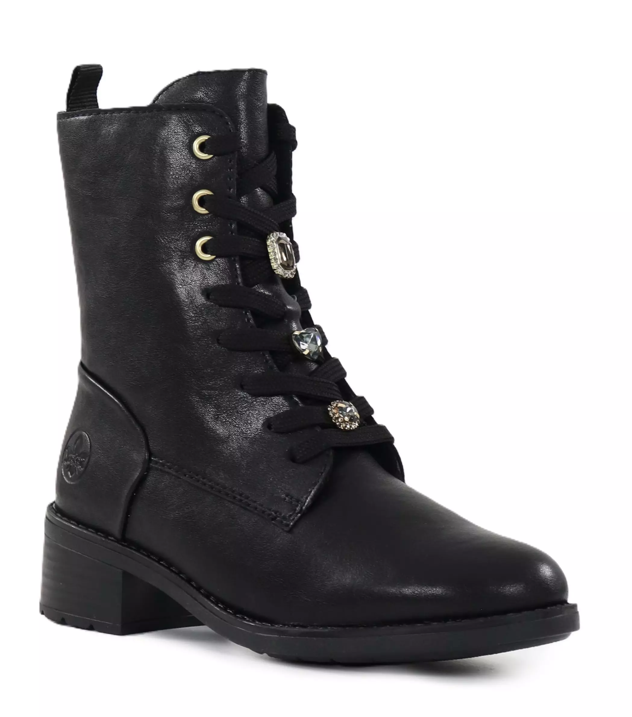 Snygga Rieker-kängor för kvinnor som värdesätter både show och komfort! Diamantprydda snören ger skon ett personligt utseende, en bred läst säkerställer volym och uttagbara innersulor ökar komforten.