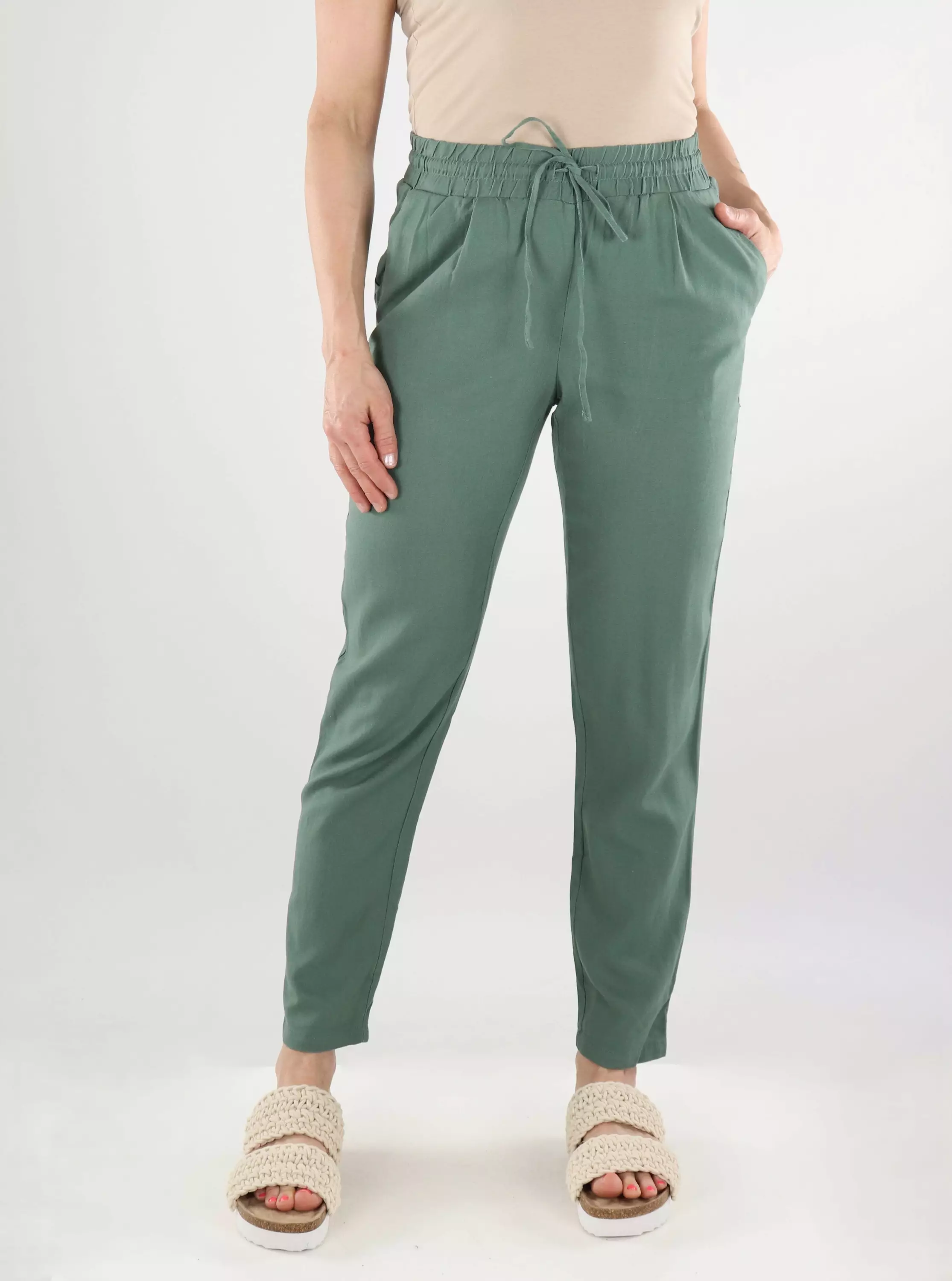 Vero Modas gröna byxor ger friskhet och färg till din sommargarderob. Den lätta och andningsbara linneblandningen håller dig sval och bekväm, och den avslappnade designen skapar en bekymmerslös men ändå stilig look.