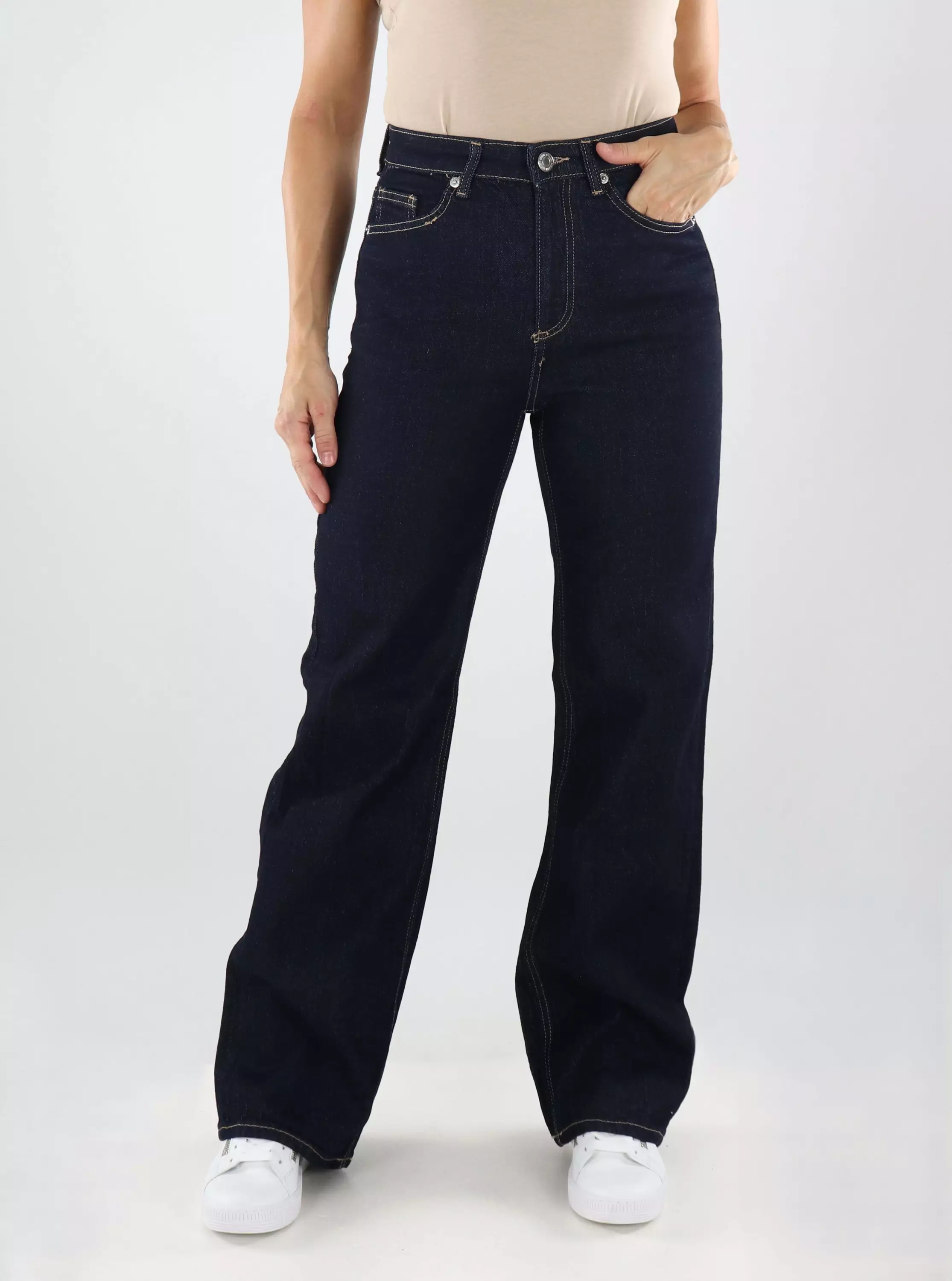 Vero Modas mörkblå jeans med hög midja och vida ben. Den vida modellen skapar en snygg och avslappnad silhuett som framhäver kroppen på ett vackert sätt. Dessa jeans är perfekta för både vardag och fritid.